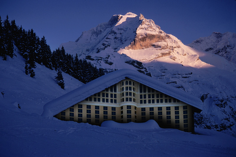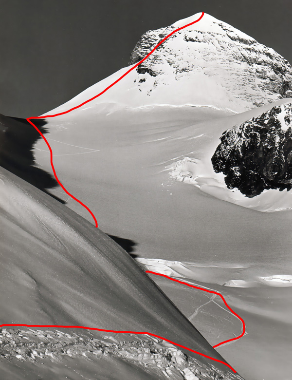 Začiatok nášho výstupu viedol cez roztrieštený ľadovec. Ak sa naň človek pozerá odspodu, alebo ešte lepšie v lete, nemôže si predstaviť, že tadiaľ vedie lyžiarska trasa. Okrem ľadovcového výstroja som vliekol aj fotografický výstroj - môj (vtedy) obľúbený aparát Zenza Bronica 6x6 s troma objektívmi, váha 6 kilogramov. Na to bolo treba mať dostatok motivácie.