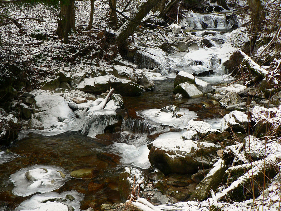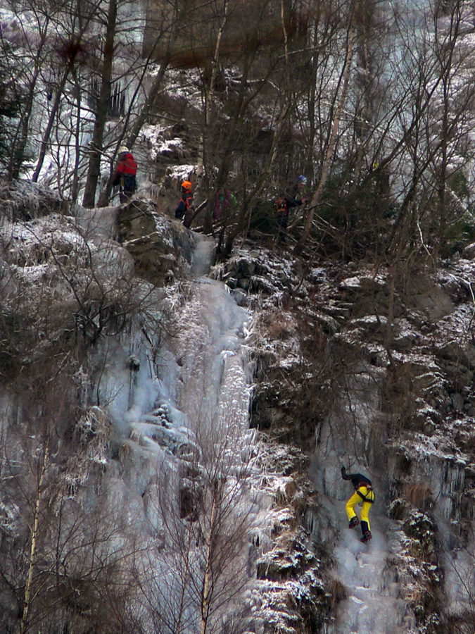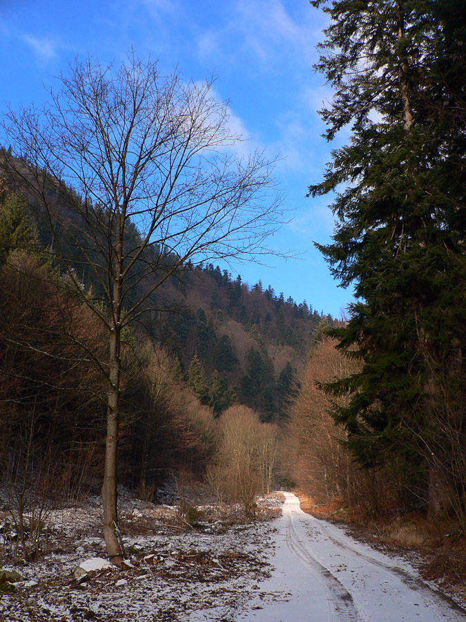 Do sedla pod Osnicou sú to z ústia asi dve hodiny, prvá po starej lesnej asfaltke. Ale nuda nehrozí. Hneď skraja obrovský kameňolom, aspoň pekne zamrznutý (keď už snehu niet), raj pre ľadolezcov. Aj v potoku pekná ľadová výzdoba, okolo cesty každú chvíľu nejaká skalka trčí, vďaka holým stromom ich aj vidno.