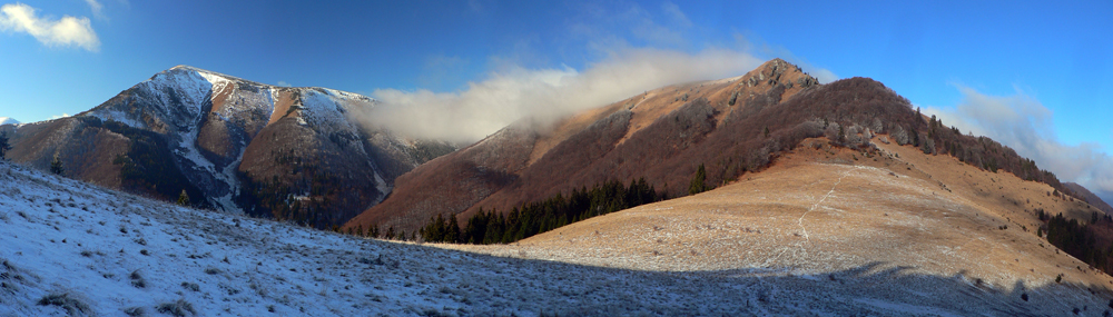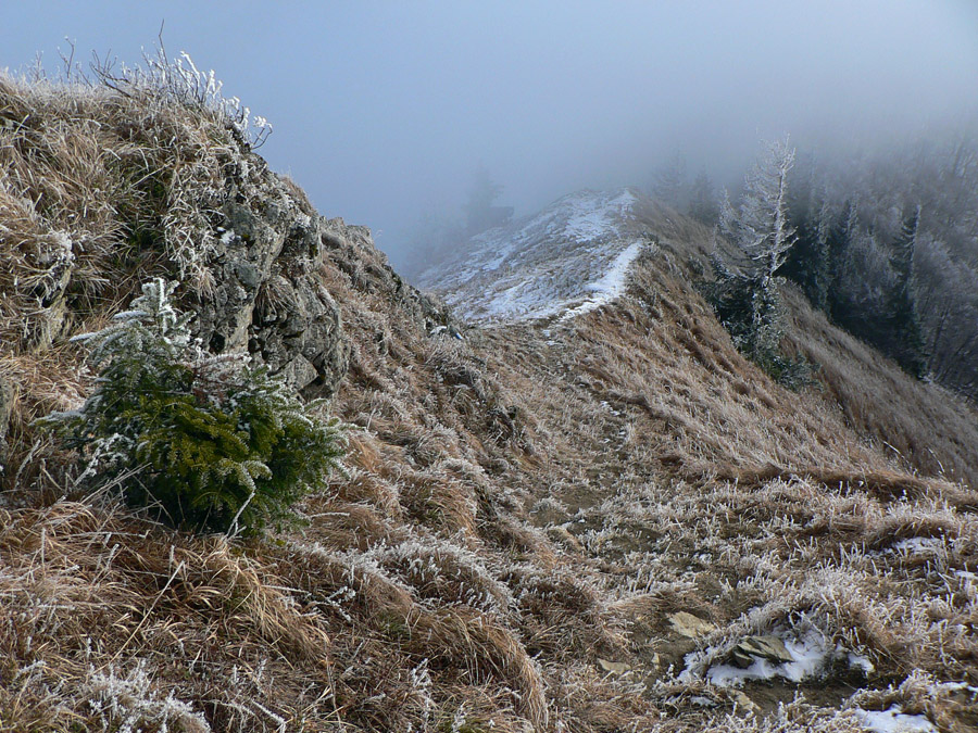 Na Osnicu je to na skok, ale taký do výšky – proste strmo hore. Zato výhľady! Ale tie si budete musieť vychutnať TUHĽA , teraz som mal na hrebeni mrak, aj keď deň okolo bol čoraz krajší. Just až pri klesaní do Strungového Príslopu sa to začalo trhať – už spod Osnice bol dole vidieť záver Bystričky a na druhej strane sa vynárala panoráma dolnej Oravy.