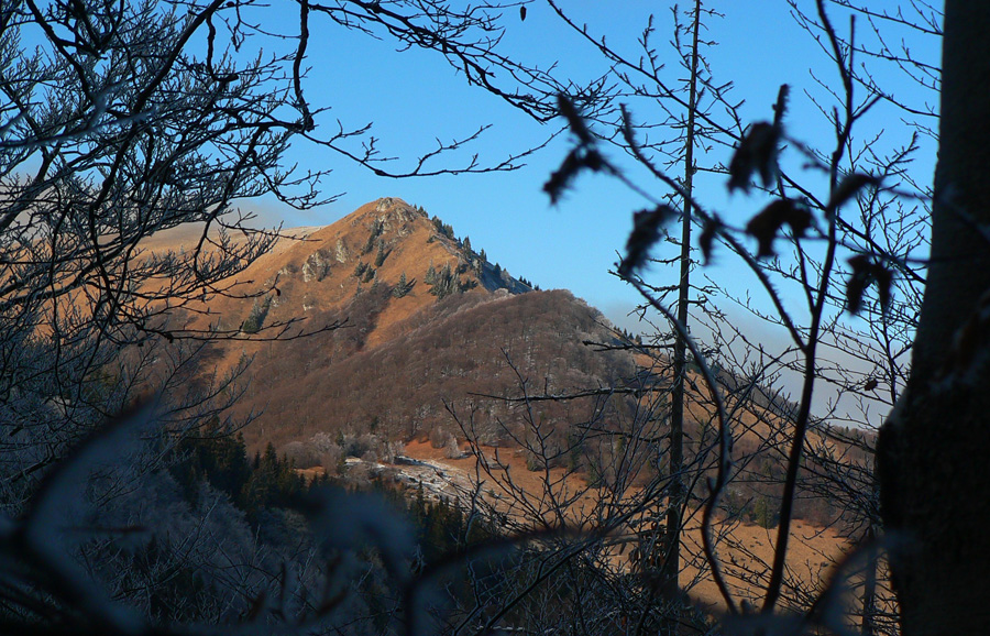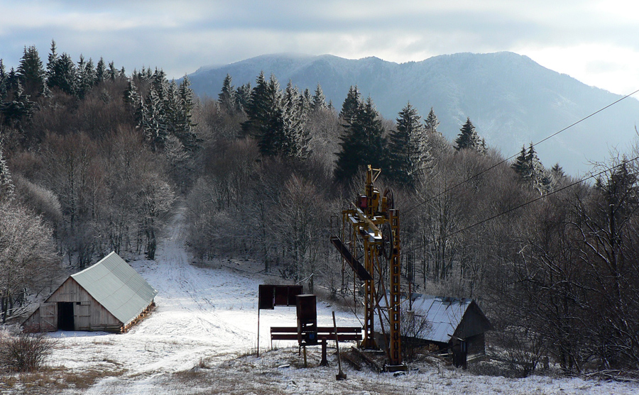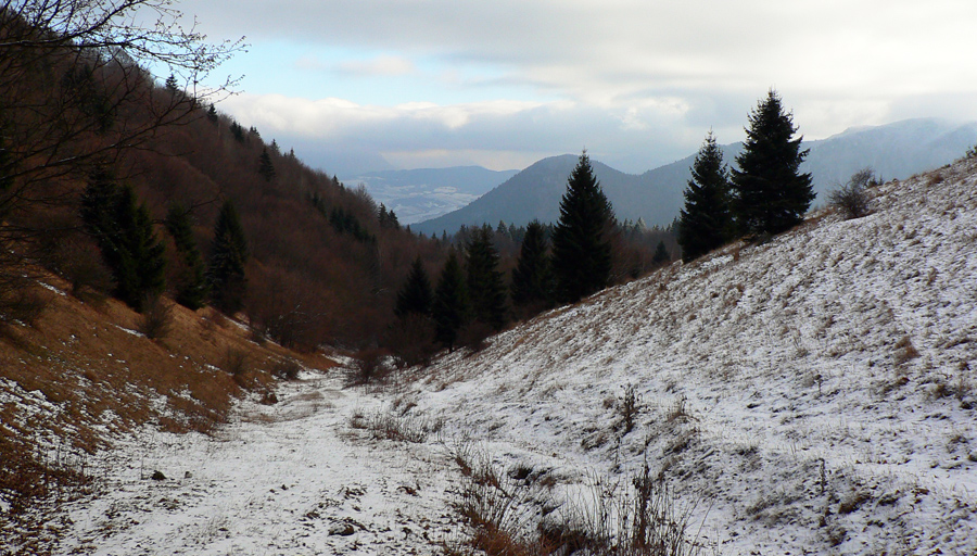 Traverz lesom k lyžiarskym vlekom je takmer bez výhľadov (aj tak treba pozorne pod nohy hľadieť), ale pomedzi konáre sa párkrát znovu ukázala Osnica a dokonca aj vršok Rozsutca. Potom už vleky, lúky a stále širší pohľad do oravskej jamy, ktorú sprava tieni masív Šípu. A z hĺbky sa vynárajúca Párnica aj s rastúcim hlukom z hlavnej cesty.
