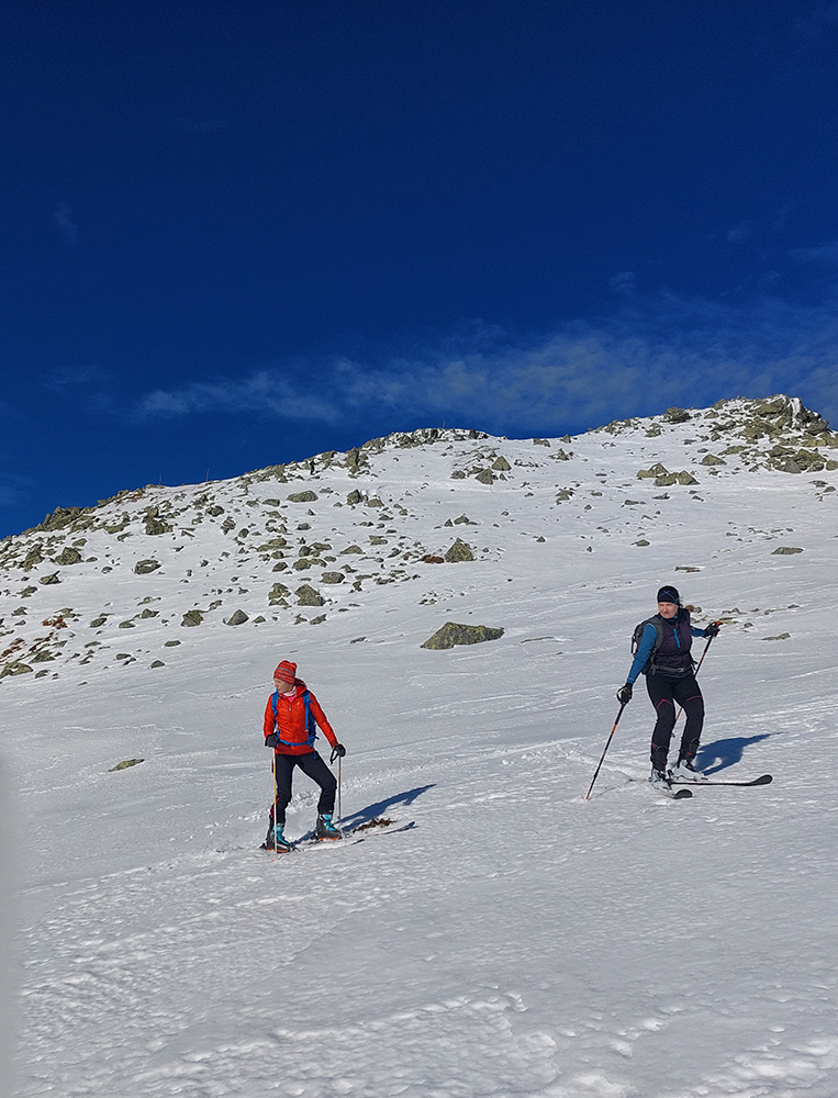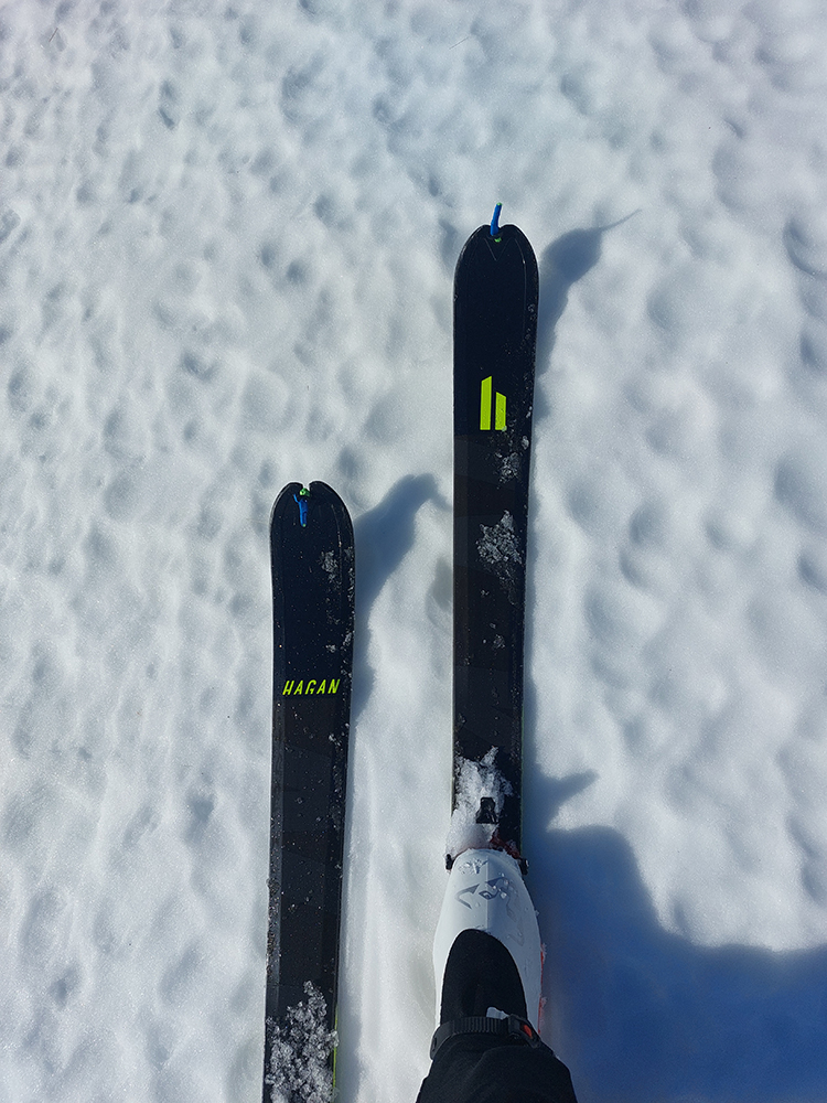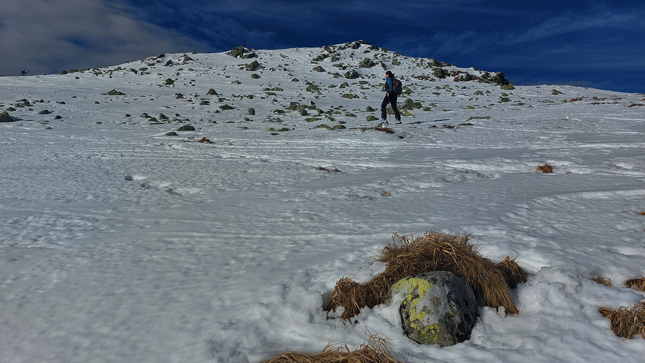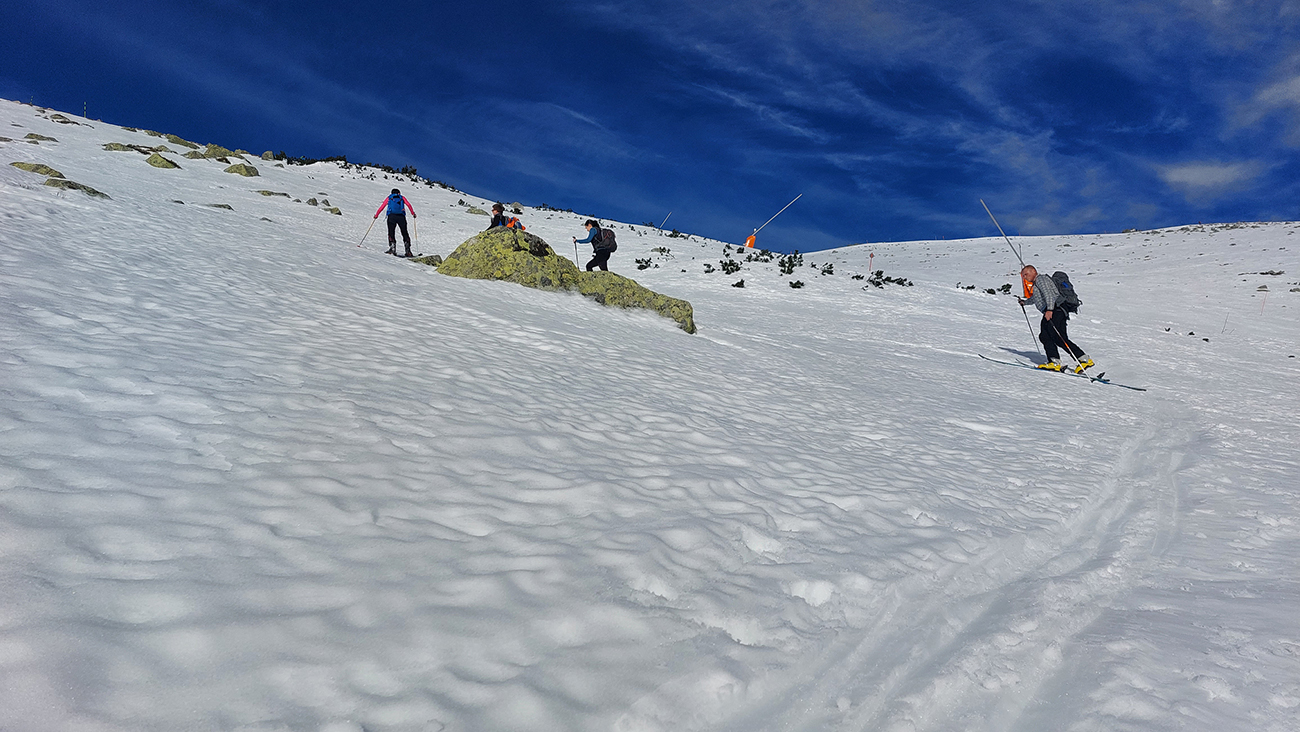 Stopa vyleštená a pevná, ale nešmýkalo sa ani v strmších pasážach – pekne to lepilo. Pásy samozrejme mokré durch, už po pár metroch a čím vyššie, tým aj teplota vzduchu vyššia. Miesta aj snehu našťastie dosť aj pomimo zjazdovky. Aj čistý bol, len buriny z neho trčali ako dôkaz jeho nedostatku.