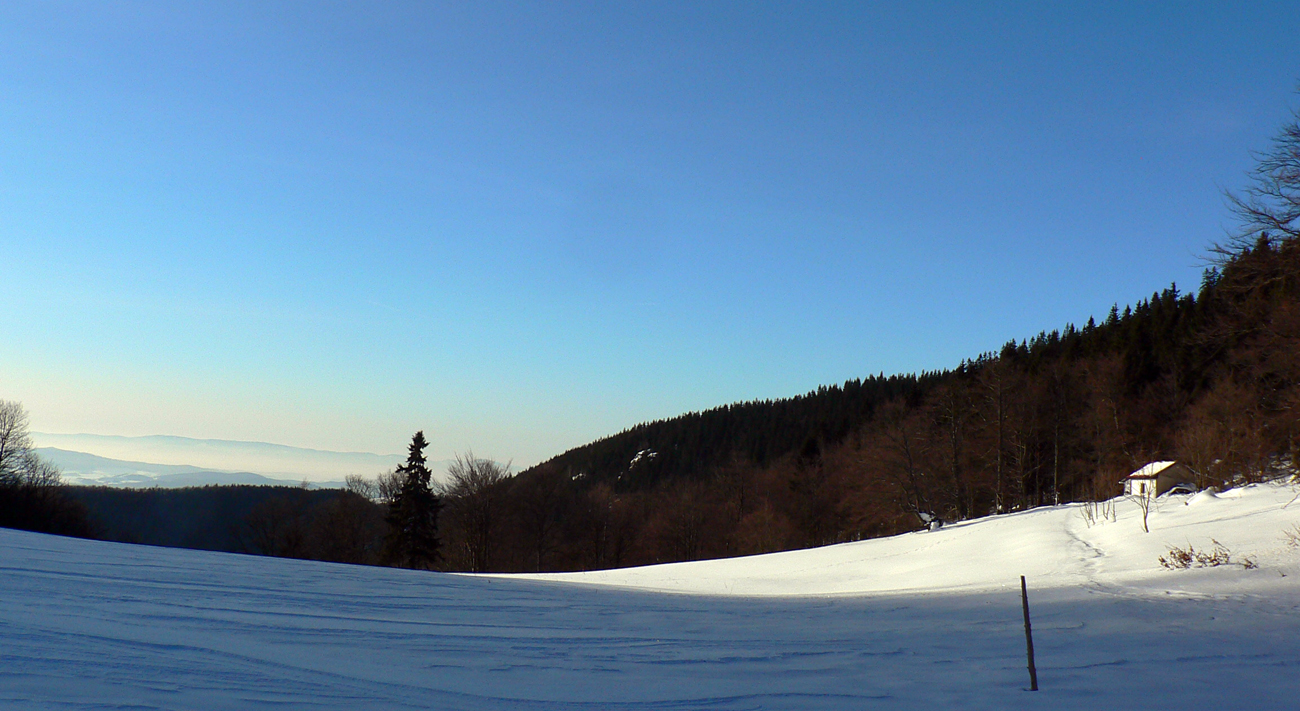 Teplota tiež príjemná jarná, jemne nad nulou, celý deň som šiel bez rukavíc, bez čapice, bez bundy. Aj keď stretol som partiu naloženú poriadne na ťažko, a pritom obalenú „v goráčoch“ aj s kapucňami. A jeden mal aj lyžiarske okuliare! Možno sa radšej potil ako opaľoval :-) Severáčik taký jemný, akurát osviežoval, bez neho by bolo prihorúco.