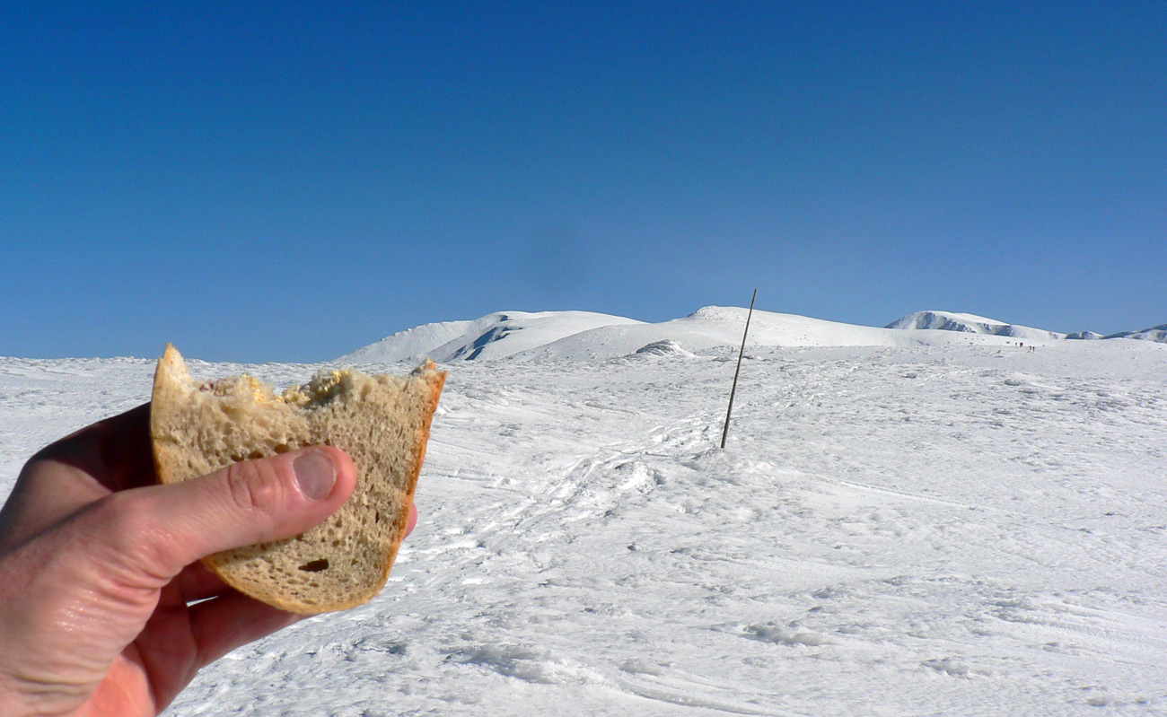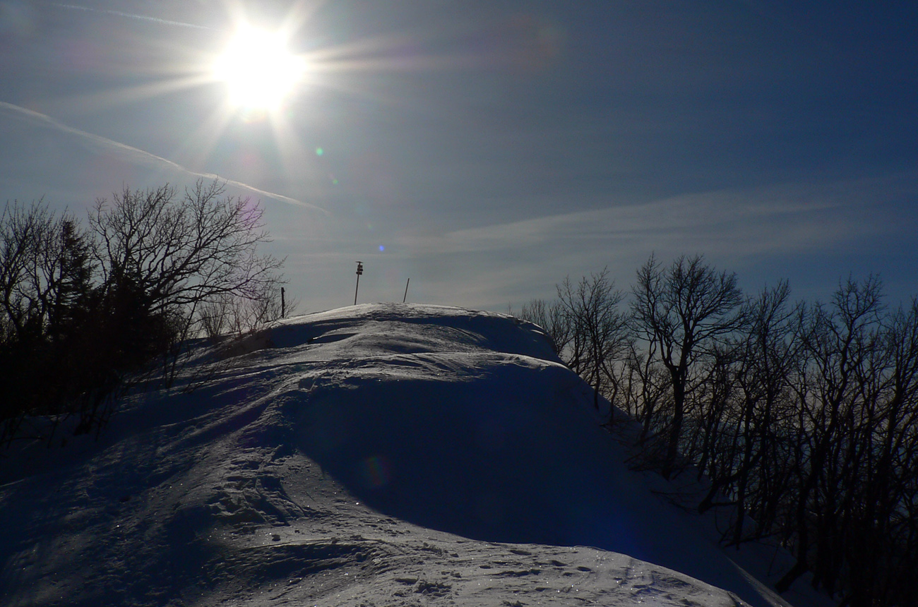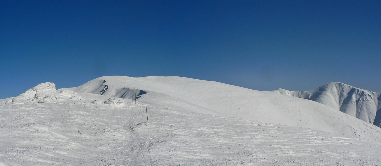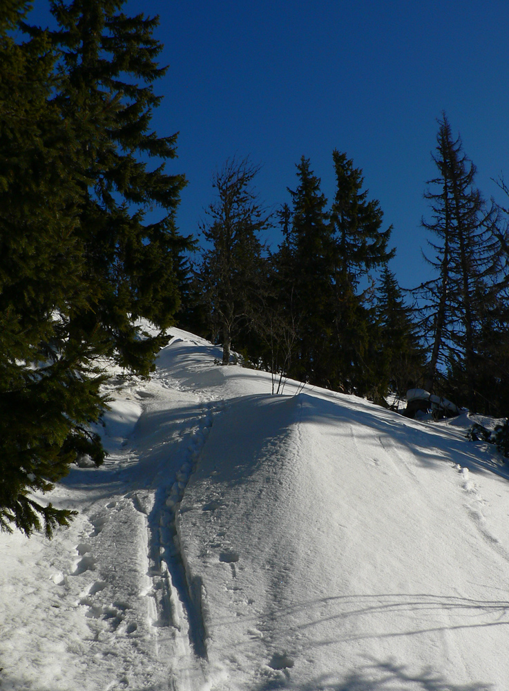 Kde to bolo pod lyžami ešte tuhé, samozrejme, že to bolo poriadne hrboľaté, vyfúkané do tvaru šindľov, žraločích zubov a podobných pásožravých patvarov. Ale chodníček vždy vydupaný pomedzi to. Pešiakmi a snežničiarmi. Ale v podstate väčšina hrebeňa je priechodná aj bez snežníc.