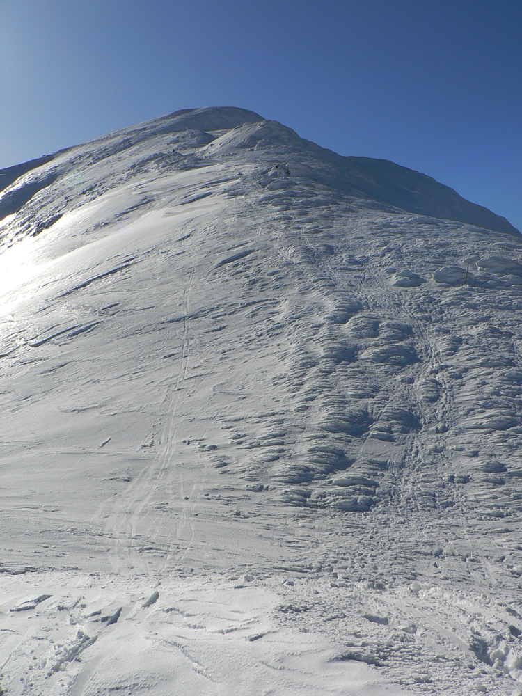 Celý masív až pod Košarisko bol síce ešte ľadový a poriadne hrkotavý, ale od Sedla pod Skalkou až na Chopok už také jarné optimum – niečo málo čerstvého, vlhkého snehu na starom, ľadovom základe. Rýchla stopa, len v prudších traverzoch sem - tam spodná lyža ustrelila smerom dole, do doliny.