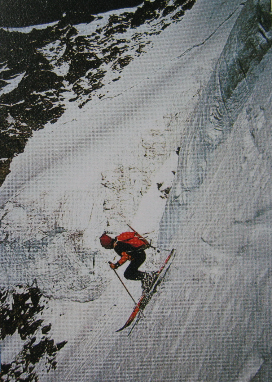 S neistotou traverzujem do žľabu, chcem skočiť, neverím si. Šúcham na hranách späť, znovu sa odhodlávam skočiť, nejde to, opäť len šúcham. Snehová kôra sťažuje pohyb, strmosť je enormná, žľab je presne štyri metre široký. Znovu zošúchavam dole na hranách, pokúšam sa skočiť ale nejde to. Ostáva len pri chcení. Až po chvíli sa konečne odhodlávam na prvý skok. Podarí sa! Pokúšam sa uvoľniť. Pohľad do hĺbky je hrozný, ale napriek tomu sa mi páči. Zjazdujem ďalej, skok za skokom. Schádzam pár metrov nižšie do 50 stupňov strmej úzkej rýny/žľabu. Zastavujem. Helmut štartuje ako druhý za mnou. Darí sa mu ako mne. Kusy zamrznutého snehu padajú dole a letia okolo mňa. Všetko vyzerá ako keby bolo v pohybe. Priatelia pomaly lyžujú dole. Moje vlastné obavy sú zabudnuté. Teraz dostávam strach o priateľov. Najmenšia chyba a...
