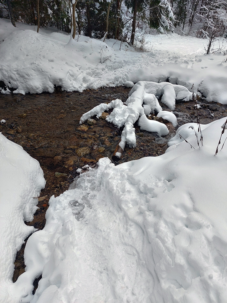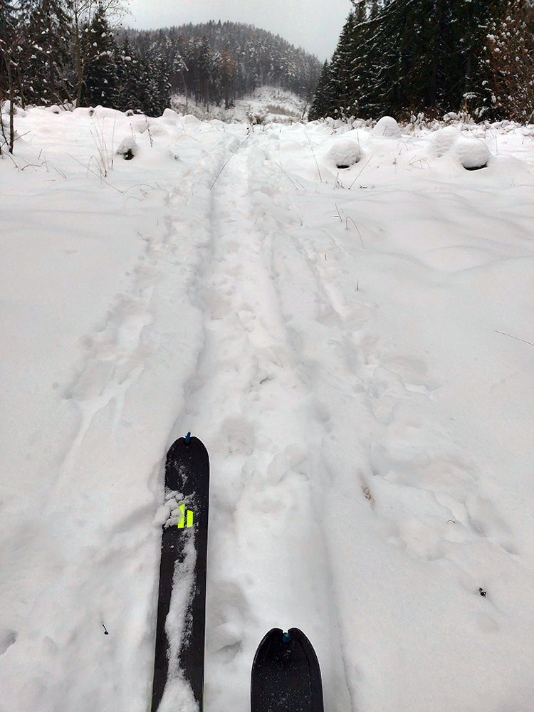 Prvá improvizácia hneď na chodníku do Hrabova: normálne by sa to dalo na pásoch, aj v lese snehu dosť a pekne utlačeného. Skoro nič netrčalo, aj tie prechody cez pramienky vysnežené – takto začiatkom zimy som to ešte nezažil, dobre to začína! Ale keď už boli lyže na batohu, neriešil som, aj tak bude treba prenášať cez parkovisko. Len som si zafixoval, že ak by som cestou nazad náhodou nestíhal ku vlaku, môžem sa tu zrýchliť.