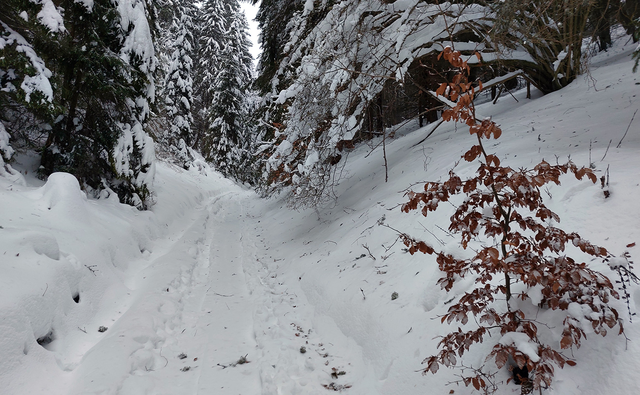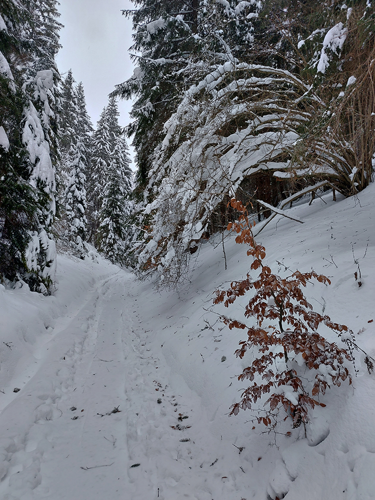 Dolina pod Mederlyčku jedna báseň. Jediný človek predo mnou to otočil niekde v polovici, tak ďalej už stopa viditeľná, ale jemne prisypaná, okolie ako z rozprávky, a tichúčko. Potiahol som rovno, že miernejšie sklonenou serpentínou sa potom vrátim.