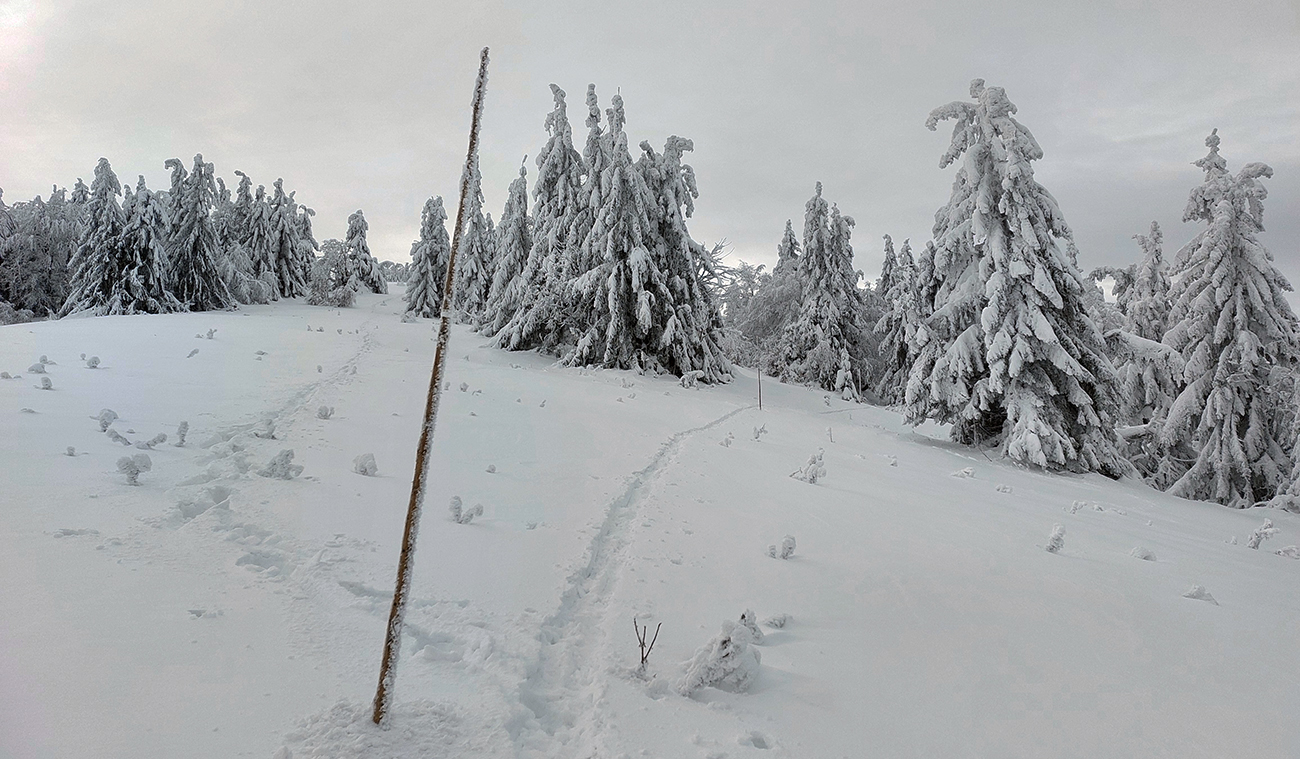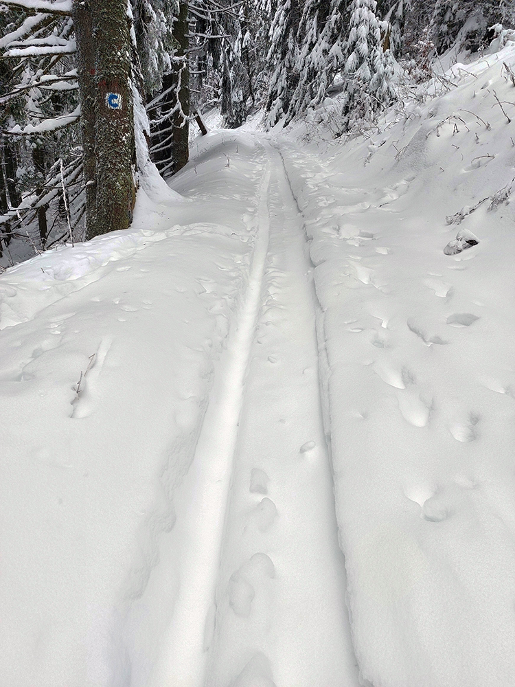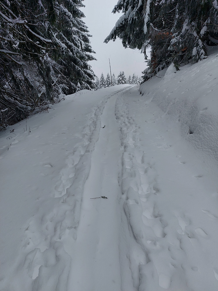 Potom už začala pravá zimná almázia. Medvedia cesta nádherná, štvrtkový odmäk a následné jemné prisneženie v kombinácii s mnohými nohami ju pekne vytvrdili - aj zjazd bude bezpečný pre sklznice. Okolo zimná rozprávka, čím vyššie, tým krajšia. Pri východe z lesa na Vlkolínske lúky pod Sidorovom obzretie doľava – zdalo sa, že zjazdiť by sa dalo aj po ceste. Stopa ďalej už ležala v hlbokej koľaji, hranica mrakov sa zhora blížila a jedinými farbami v okolí boli špičky šípiek na turistickom ukazovateli: