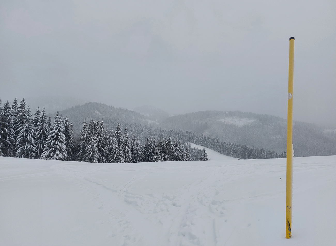 Okolo Šiprúňa klasické preveje, za nimi opatrný zošup do sedielka - na slepo, lebo v hmle. Stúpanie na Jánošíkovu kolkáreň ešte trochu úzke – ďalšie miesto, kde bude nutné zjazdovať cestou nazad opatrne. Na zasypaných lúkach nad rekreačným strediskom to niekoho náramne bavilo, brodiť sa v snehu a zapadávať po stehná. A kaziť stopu – lebo vedľa nej by vôbec nezapadal rovnako, že?