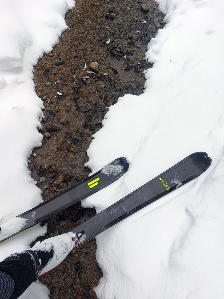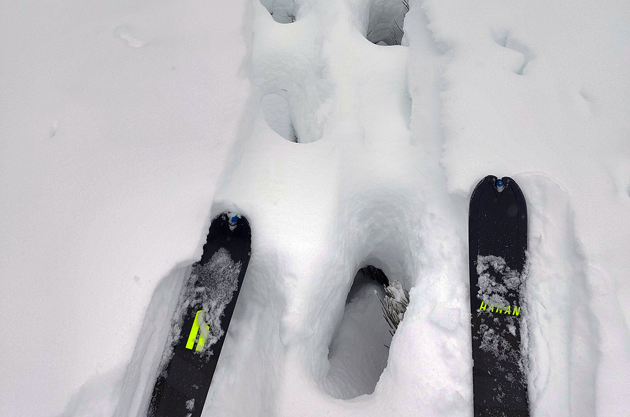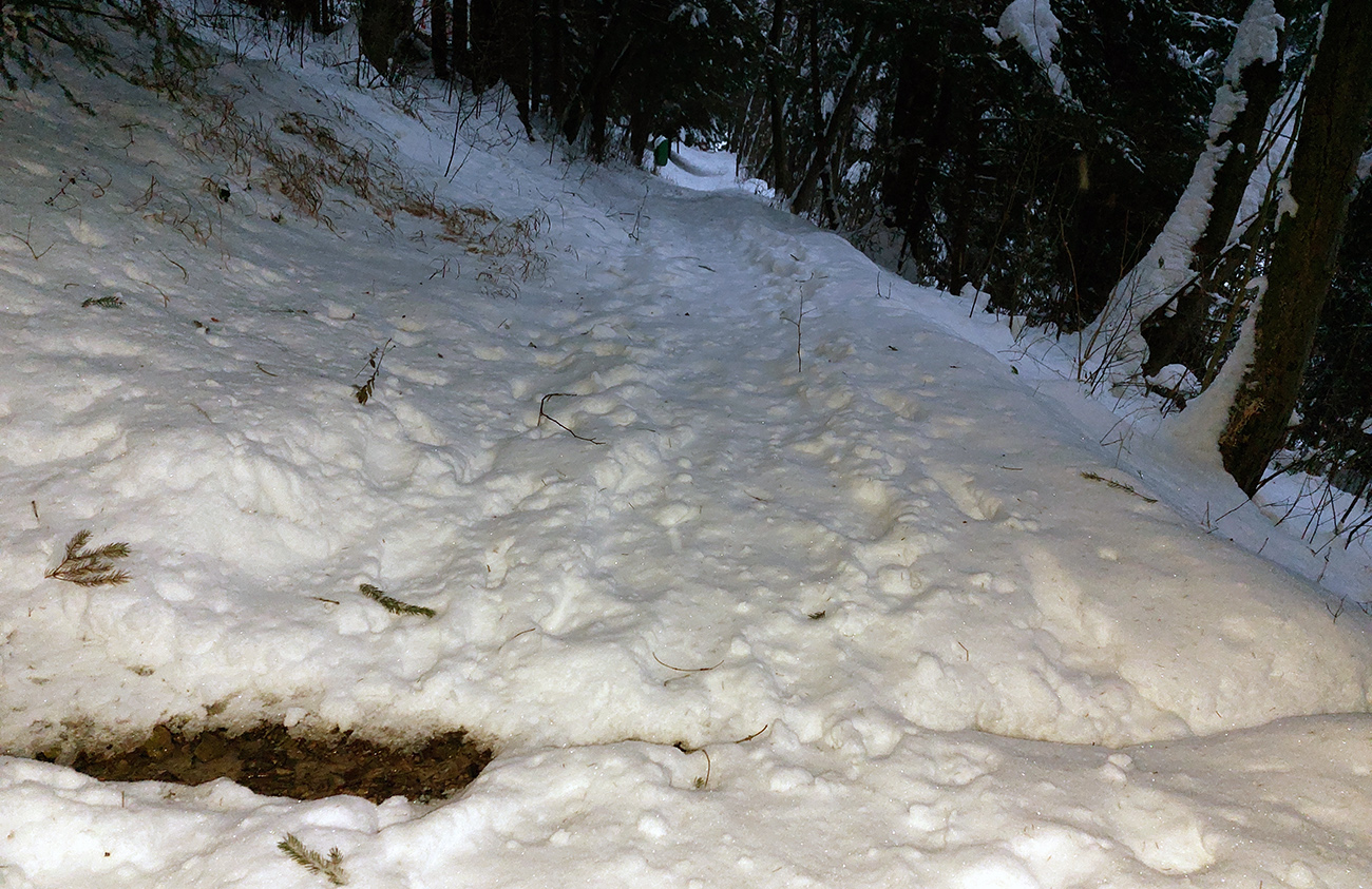 Pri lanovke ceduľa, že zákaz vstupu na zjazdovku, chodia tam ratraky. No, za rannej polotmy ešte nechodili, ale zúrivo tam syčali delá, rešpektoval som – a teda nastala ďalšia improvizácia: direkt hore popod lanovku, na Medvediu cestu. Už na pásoch, stopa komfortná, ale na cestu dole to práve tu nebude. To bude treba zbehnúť po svojich, pomedzi to všetko, čo okolo trčí spod snehu.