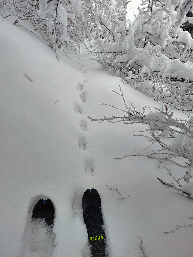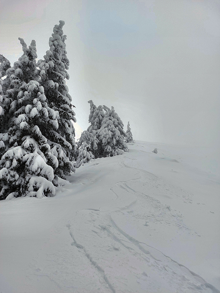Ale to naj naj naj malo ešte len prísť. Už som sa tešil, že snehu pod nohami s výškou ubúda, pomohla aj stará skialpová stopa, tvrdšia ako okolie. Ale vtom hup – a bol som jednou nohou až po oné v snehu. Vytiahol som ju, druhý krok a hup, zase. To kosodrevina pod vrcholom Rakytova – zaviata síce, ale nie dosť nosnou vrstvou. Tak palice do rúk naprieč, kľaknúť na všetky štyri a davaj posúvať sa po decimetroch hore. Ešte že mlieko plnotučné, hádam ma nik nevidel, ako sa tam mrvím. To už som nemal chuť ani odfotiť, tú brázdu ako po parníku, ktorá za mnou ostávala. A hneď, ako som len začal tušiť obrys kríža na vrchole, koniec. Nazad na dve nohy, obuť jednu lyžu a že sa ide paraolympijsky lyžovať. Teda najprv traverzovať. Ale celé zle! Tak čo – posledný zúfalý pokus, že skúsim nacvaknúť aj druhú lyžu, zavretá päta možno pomôže. A hurá, ono to držalo!!! Síce som v tom neviditeľne chvíľu cikcakato hľadal správny sklon a smer, ale potom, čuduj sa svet, som si dovolil dokonca zopár prašanových oblúkov, aha:
