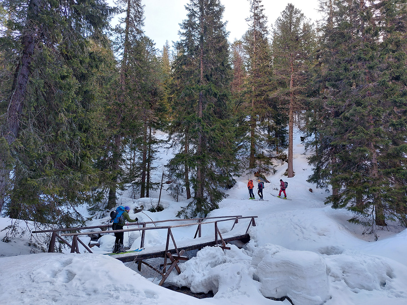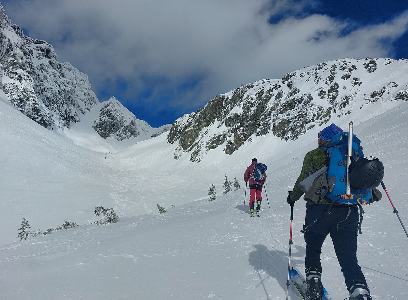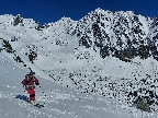 Žľab zo Sedla nad Skokom aj susedný Široký krásne nasvietené a ten druhý aj intenzívne polyžovaný, nad hlavami azúro a pohľady do doliny ako z reklamy. Len sneh už ráno začal v strmších južných orientáciách trochu lepiť. Ale plánovaným cieľom bol Kôprovský štít a tam, že sa uvidí. V doline celkom intenzívna premávka, pomaly nás obiehali partie, aj početné skupiny. Okrem Červeného žľabu hádam všade sa mrvili čierne bodky.