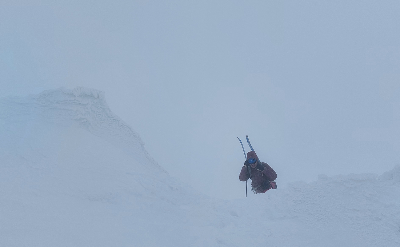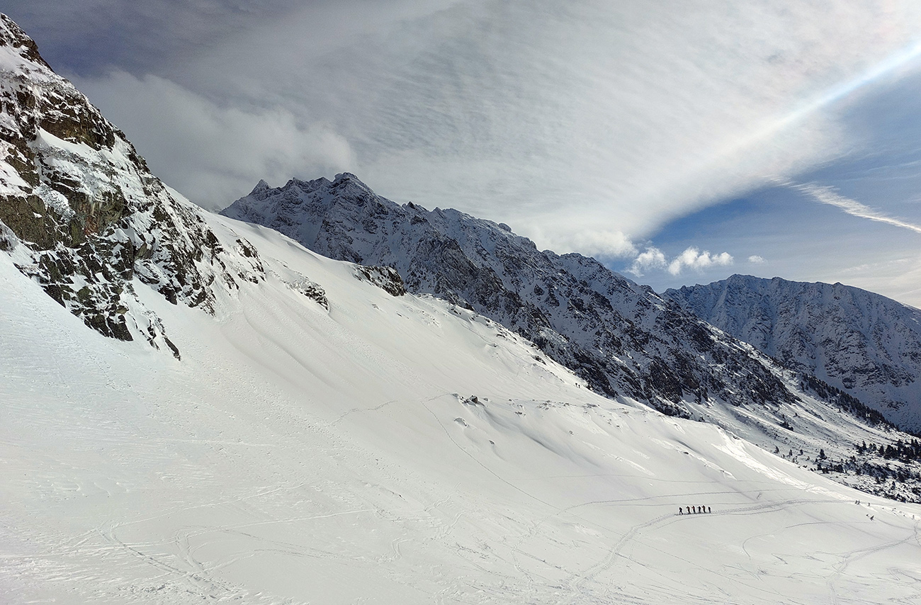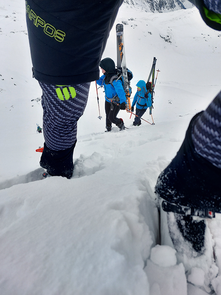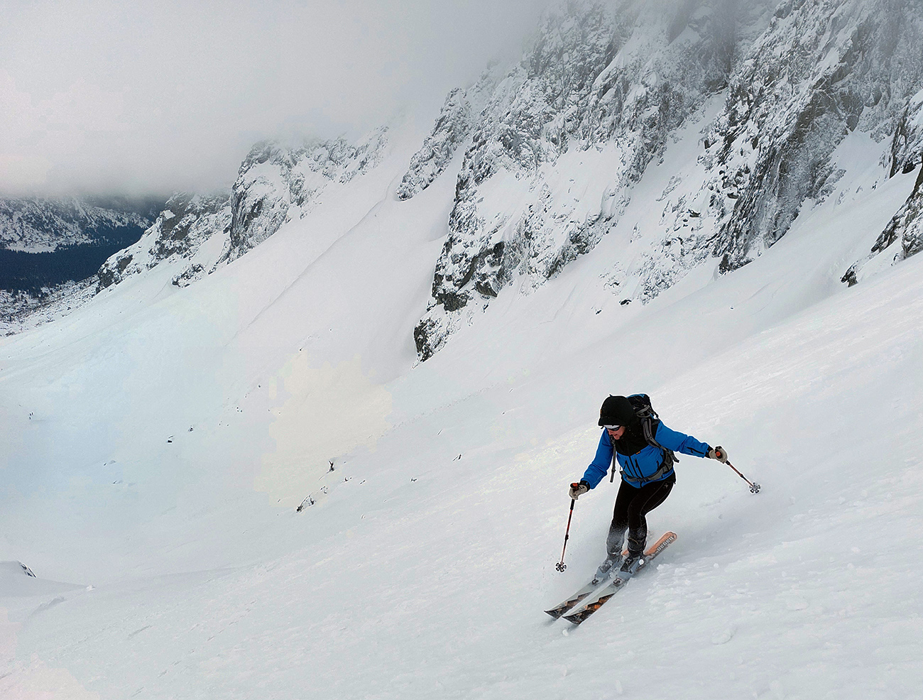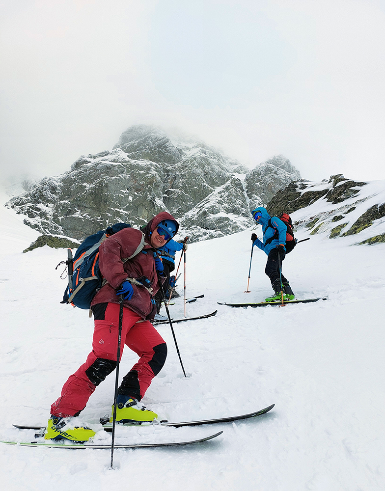 V prechode do strmého záveru výstupu pod Vyšným Kôprovským sedlom lyže na batoh. Stopy už boli, pohodlne to išlo aj bez mačiek, tuhá a pevne prilepená čerstvá nádielka poskytla takú akurát oporu. Len to už prihučali mraky, zachytávali sa stále nižšie na vrcholkoch a začínala difúzka. V sedle už poriadne fučalo, na Kôprovský už sme ani nešli, nebolo tam vraj vidieť ani na krok – hovorili tí, ktorí už sa vracali.