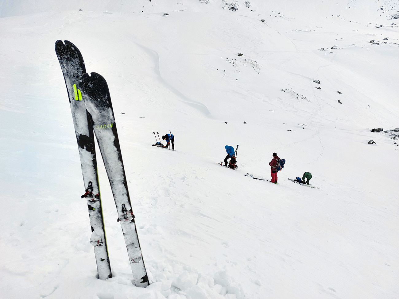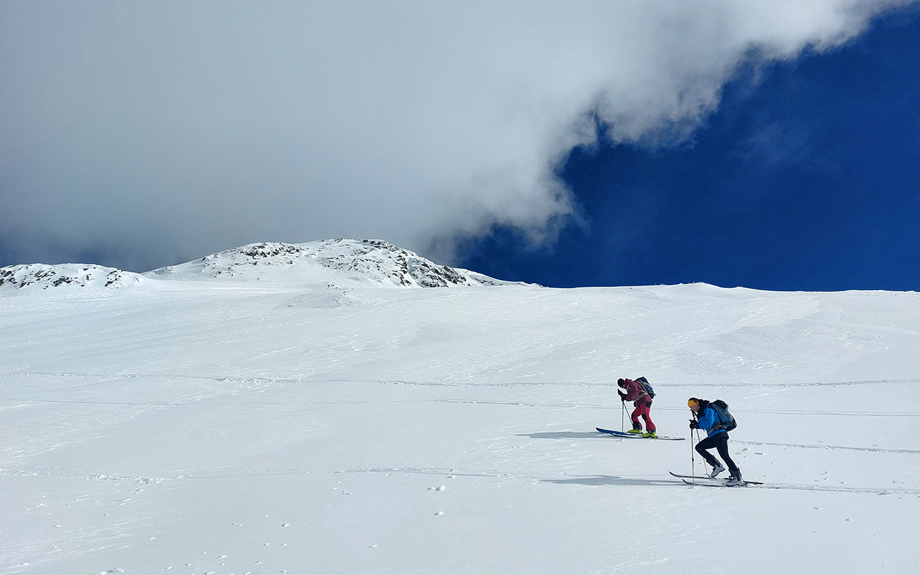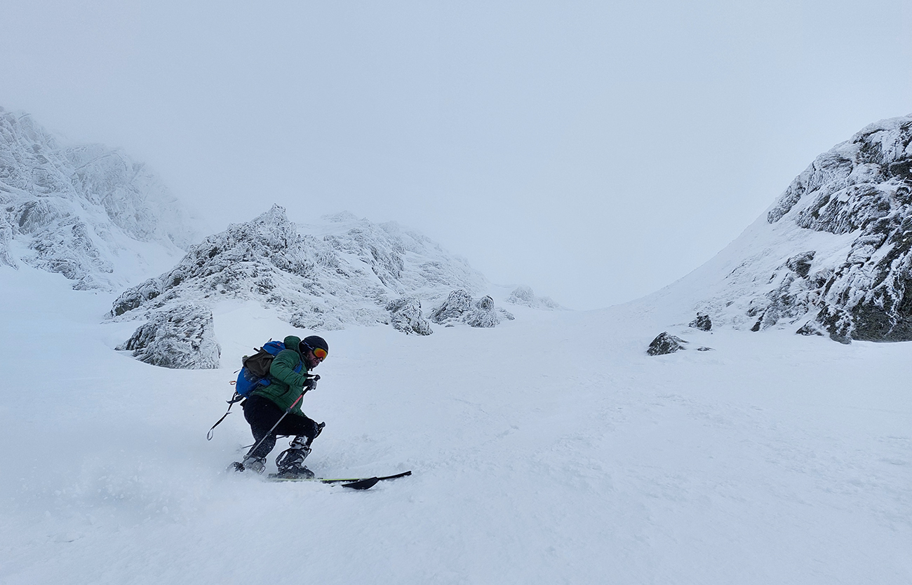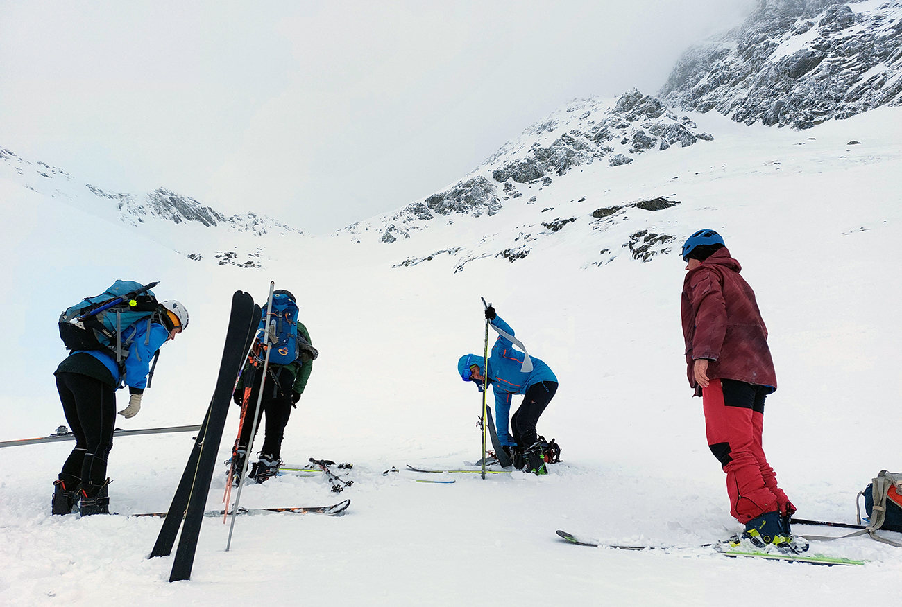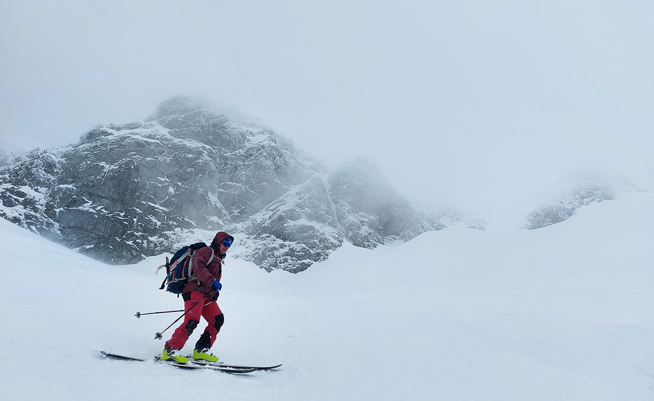 V prechode do strmého záveru výstupu pod Vyšným Kôprovským sedlom lyže na batoh. Stopy už boli, pohodlne to išlo aj bez mačiek, tuhá a pevne prilepená čerstvá nádielka poskytla takú akurát oporu. Len to už prihučali mraky, zachytávali sa stále nižšie na vrcholkoch a začínala difúzka. V sedle už poriadne fučalo, na Kôprovský už sme ani nešli, nebolo tam vraj vidieť ani na krok – hovorili tí, ktorí už sa vracali.