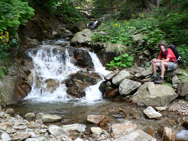 Úvodná časť má mierny sklon, ale aj tak už treba skákať z kameňa na kameň a preliezať spadnuté stromy (obrázok 1). Najmä tých stromov bude vyššie viac a čoraz šmykľavejších. Prvou raritou na trase, len pár stoviek metrov od konca cesty je „pomník“ ľudskej činnosti (obrázok 2) v podobe zhrdzaveného drviča kameňa. Malý, len asi 9 metrov vysoký kameňolom, ktorý tu voľakedy fungoval, už našťastie nie je v teréne veľmi viditeľný. Zato v koryte potoka sa doteraz váľajú zvyšky lana a dokonca aj jeden vozík z nákladnej lanovky. O kúsok vyššie si potok na niektorých miestach prelamuje cestu úzkymi kaňonmi – lemované sú strmými stenami z amfibolitu, čo je jedna z najstarších hornín u nás (obrázok 3, 4). Aj širšie okolie je vraj najmä pre geológa veľmi zaujímavé. Prvé z vodopádov, ktorých je na trase neúrekom, sú skôr také menšie „vodoskoky“ a dajú sa pohodlne obísť alebo preskákať po kameňoch (obrázok 5, 6). Ako porovnávacie meradlo mi poslúžil dvojmetrový kamarát - spolulezec.