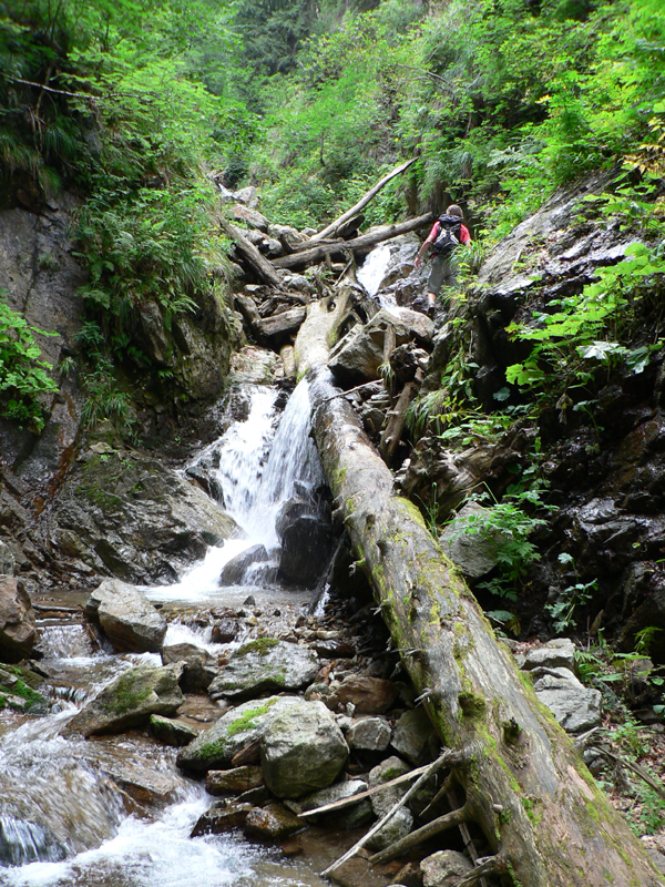 Postupne sú vodopády čoraz vyššie a častokrát sa dajú preliezť len za cenu premočených nohavíc a topánok (obrázok 7), niektoré ale treba riadnou okľukou obísť. Vodopády oddeľujú úseky koryta s miernejším sklonom, kde pohyb komplikujú tie hnusne šmykľavé kmene a riadne balvany (obrázok 8). Kto sa zapotí alebo zasviní viac, ako je mu milé, môže sa okúpať v niektorom z početných a dosť hlbokých „obrích hrncov“ pod niektorými vodopádmi (obrázok 9).