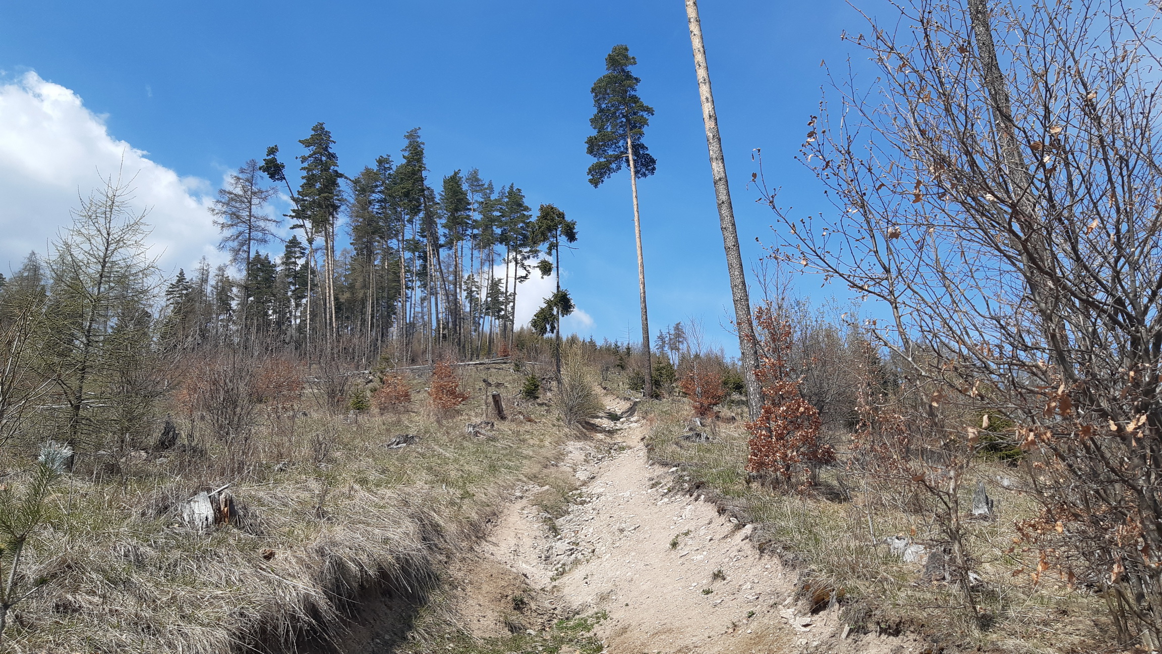 Na hrebeni sa napojíme na pekný chodníček, miestami je ale ešte poznačený nedávnou zimou s polámanými a vyvrátenými stromčekmi. Idúc chodníčkom miestami náročnejšie orientačnom (nie už pre nás čo sme tu ako doma) sa pripojíme na modrú značku vedúcu zo Spišskej Teplice na Kozí kameň.