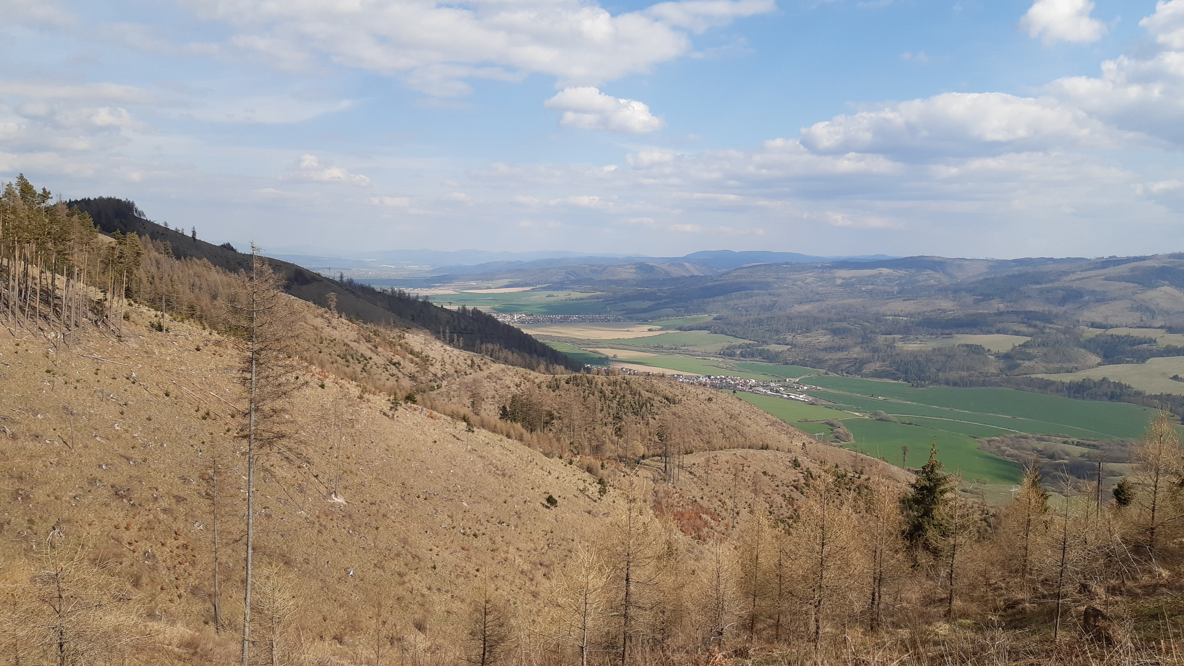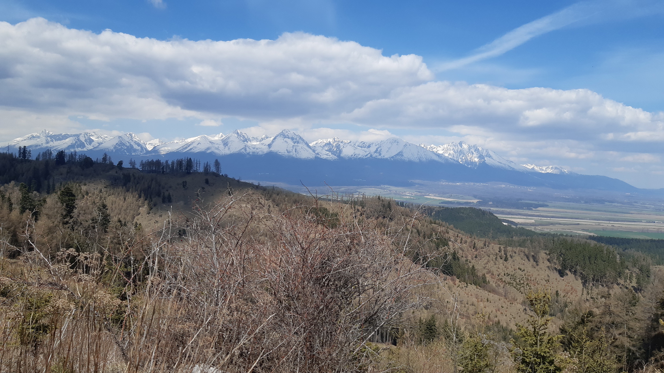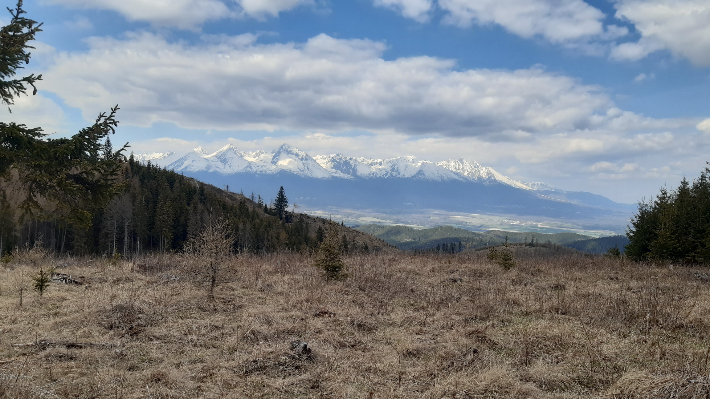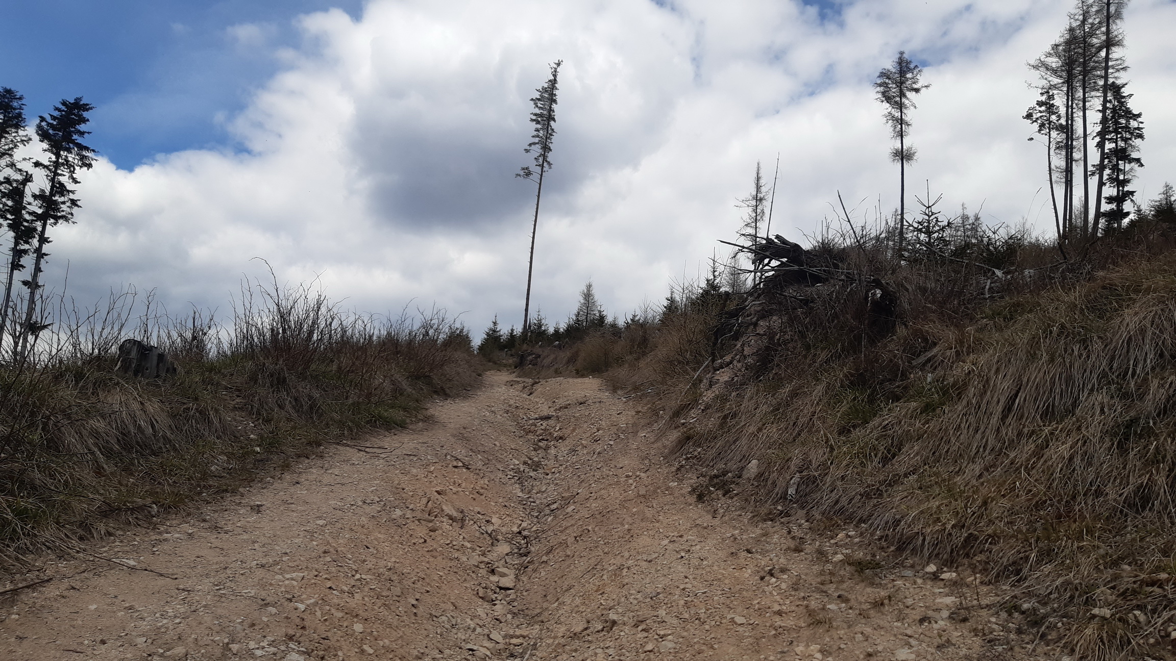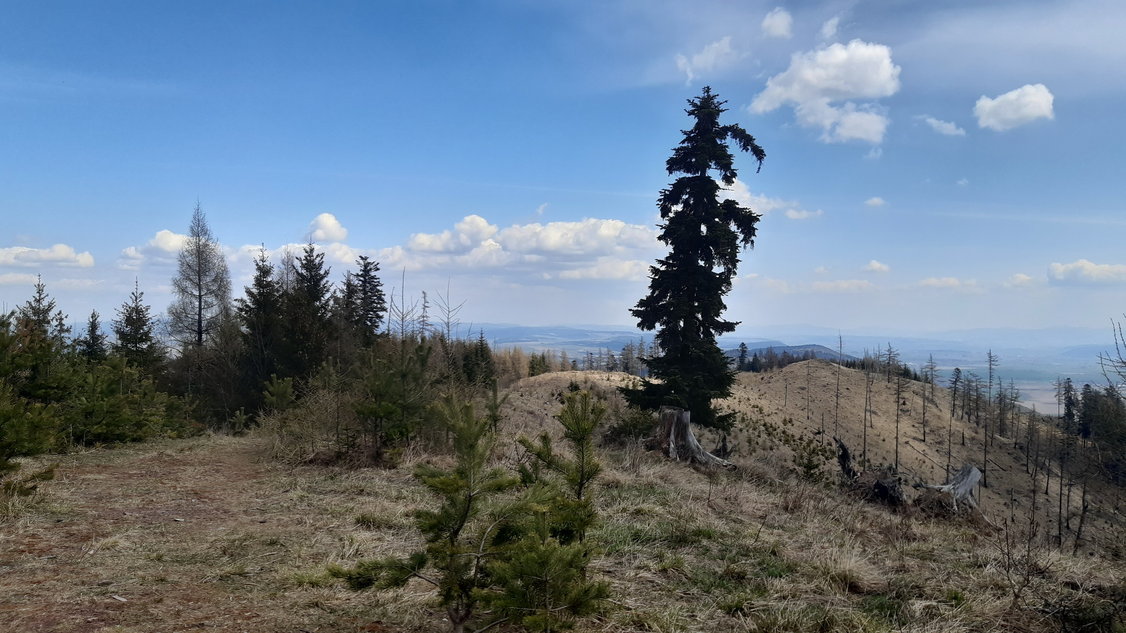Lesných ciest je tu pomerne dosť. Pred pár rokmi túto oblasť postihla silná veterná kalamita ako už ináč následovaná kôrovcom... Trošku sa to tu presvetlilo a po harvestoroch ťahajúcich drevo ostali ťažobné linky vedúce po spádniciach. Jednou takouto pokračujeme aj v našej túre. Vedie nevýrazným hrebeňom, už je poznačená eróziou a dovedie nás na postupne zmierňujúci sa hrebeň. Ním už vedie krásna lesná cesta s parádnymi výhľadmi na Vysoké Tatry a rovnako na ľavej strane aj na Kráľovú hoľu.