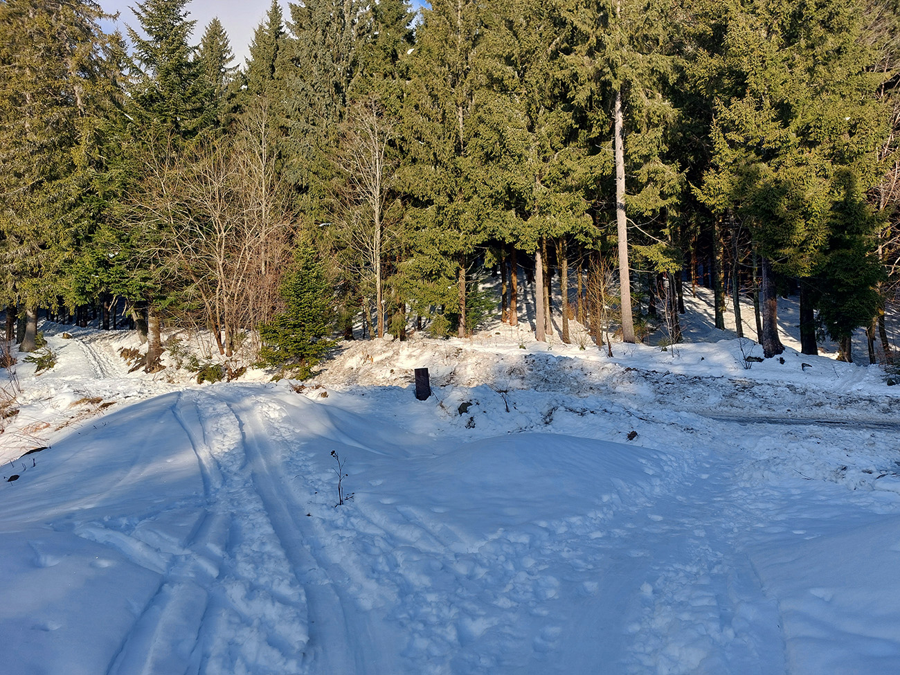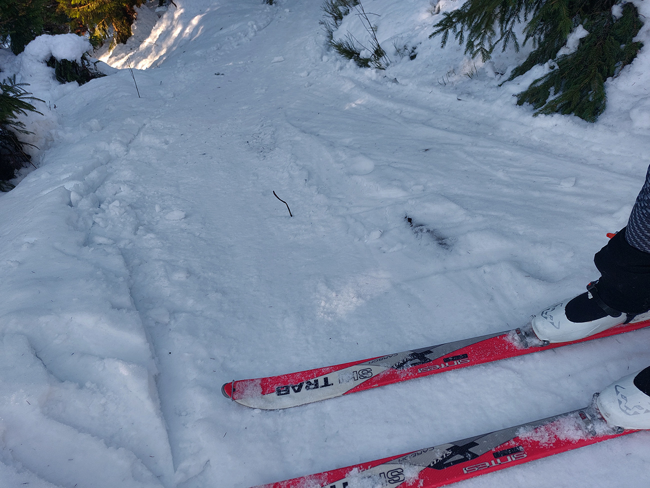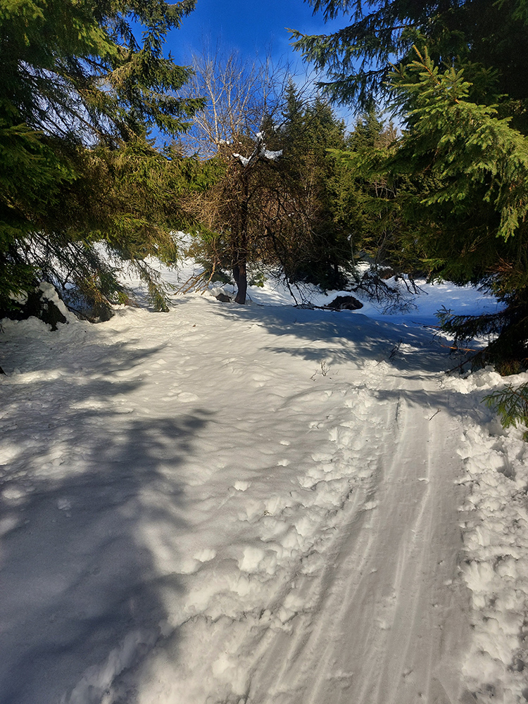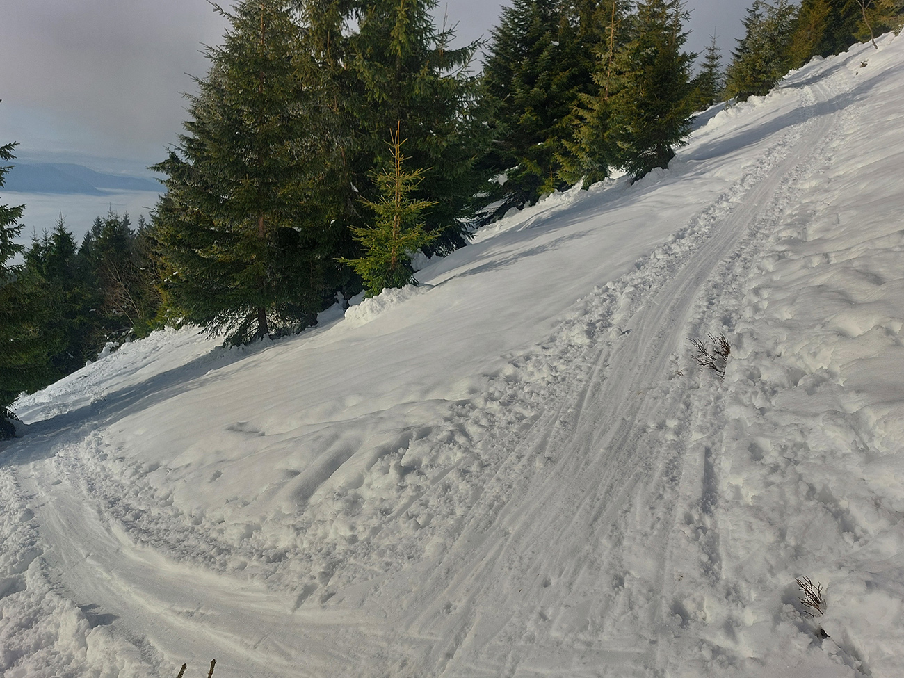 Takmer rovinky po hrebeni, až do lesa nad Príslopom: rýchle, svišťavé, stopa vyleštená, hlboká, len mimo nej prepadák alebo na severnejšie otočených sklonoch nenosná kôrka. Zatočiť v tom pri rýchlejšom zjazdovaní? Takmer nemožné. Inak ale paráda a ďalekéééé pohľady, tu zas najmä na sever. Ideál na lyžoturistiku, aj nejakí bežkári sa tam premávali.