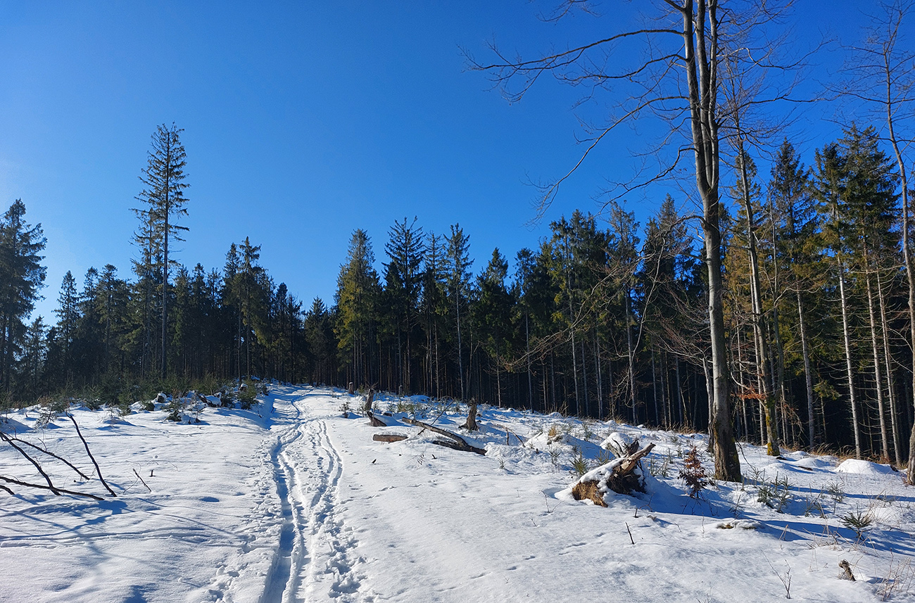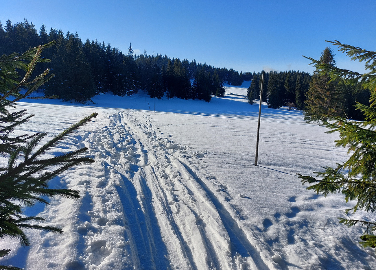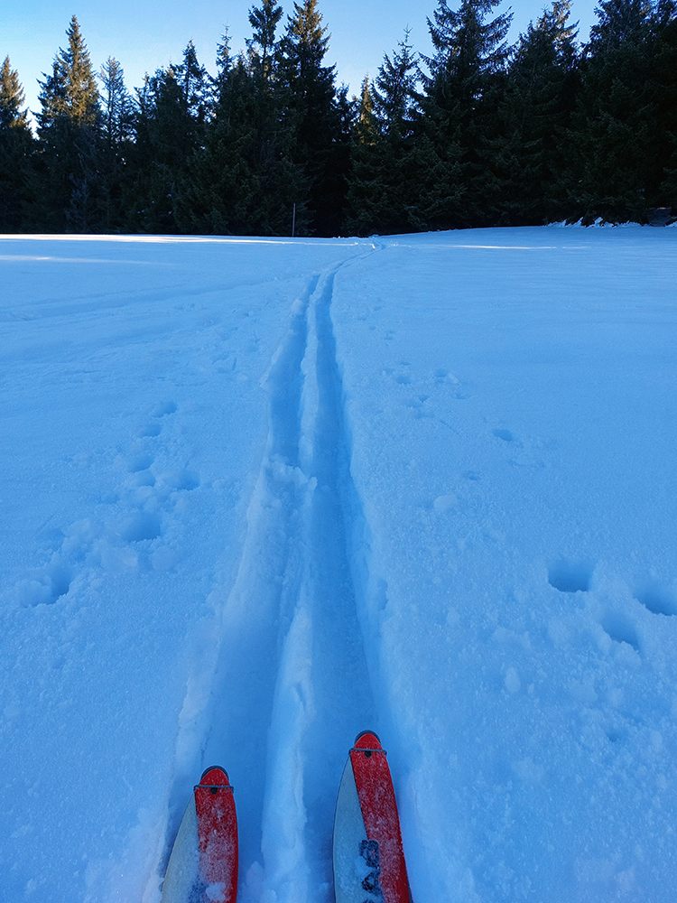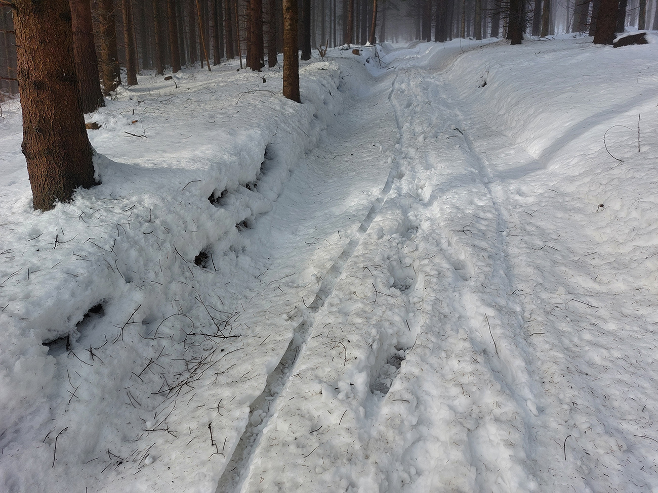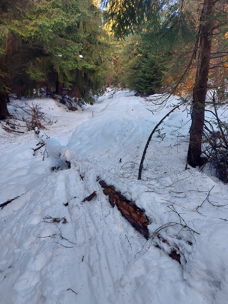 Takmer rovinky po hrebeni, až do lesa nad Príslopom: rýchle, svišťavé, stopa vyleštená, hlboká, len mimo nej prepadák alebo na severnejšie otočených sklonoch nenosná kôrka. Zatočiť v tom pri rýchlejšom zjazdovaní? Takmer nemožné. Inak ale paráda a ďalekéééé pohľady, tu zas najmä na sever. Ideál na lyžoturistiku, aj nejakí bežkári sa tam premávali.