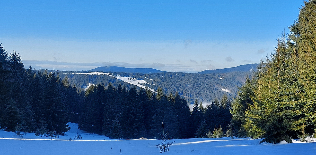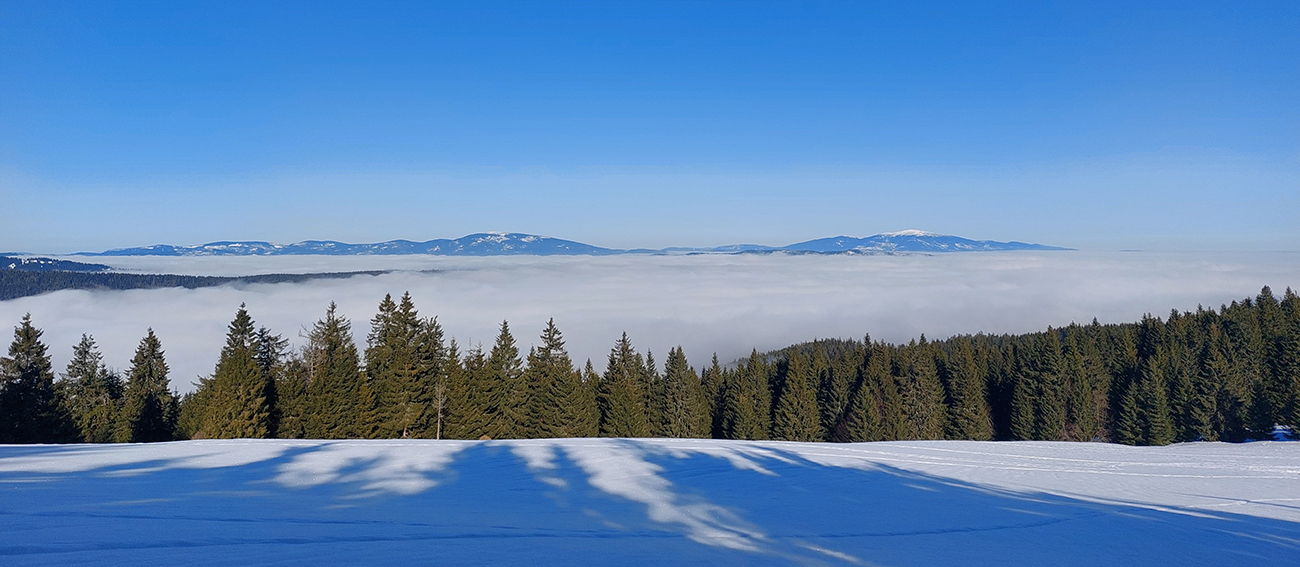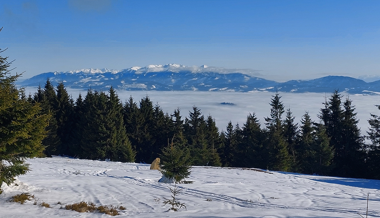 Nasnežilo. Zvodnatelo. Sfirnovatelo. Sadlo. A zamrzlo. Čiže základ sa tvorí, to je fajn, ale na lyžovanie ani pomyslieť: hrubá vrstva navlhnutého snehu všetkých konzistencií podľa sklonu svahu, ale na tom všade hnusná krusta, ktorá 70 kg väčšinou neunesie, zato za nohy ťahá fest. Teda aspoň okolo Kubínky, kam ma zatiahla ponuka rodinného odvozu zadarmo. No nezober to... Ale na pohodové rovinkové pošmýkanie je tento podklad teraz ideál, a preto aj hrebeň Oravskej Magury: všade naťahané vyleštené, rýchle koľajnice, pritom nie moc ľadové, sneh chytľavý. Len pod hustejšími smrekmi trochu viac impregnovaný ihličím a občas striehol nejaký ten malý žralok. A navyše sobota 17.1. bola s teplotou okolo nuly, s modrou oblohou bez vetra a vysoko nad hladinou hustého kotlinového mlieka. Skoro na tričko, isto bez rukavíc, celý čas. Tak som to na rozdiel od predošlej vychádzky ( TU ) vzal hore vpravo od zjazdoviek, odšmýkal sa do Príslopu a otočil to nazad. Potom už ma hnali, že sa ide domov: