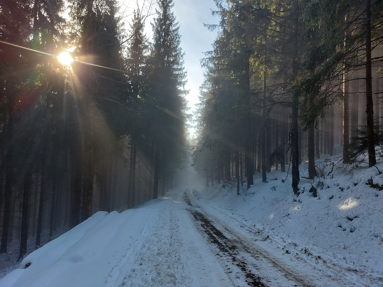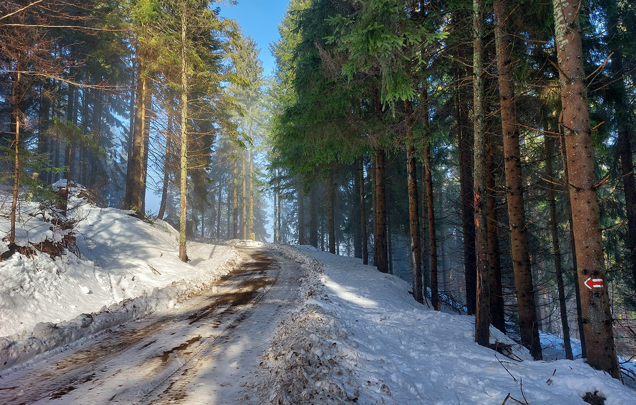 Na hranici hmly: pásy dole a dobrodružné, netočivé, prepadavé zliezanie dole do Príslopu. Strmšie, ale nie dlhé, dalo sa to vydržať. Dosť snehu (už vlhkého) aj na únik medzi stromy. A že bol ten sneh už aj sadnutý, konáre a iné oné bolo vidieť pod nohami. A že bola dobrá teplota aj dole pri ceste v tej riedkej hmle, nastal čas na malý piknik: