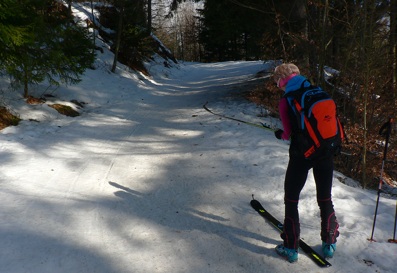 Po výleze na asfaltku pod Kalužnou: popri ceste, popri mantineloch sa dá, ale špinavo a kamienkami pomakované, pešiakmi rozchodené. Lepšie je preskočiť cestu a prekľučkovať pomedzi bukovú mladinu - stopa parádne natiahnutá a pešiaci majú vedľa vlastnú, tak je aj hladká. Vyššie v dospelom lese sa síce obe stopy spájajú, ale to už je na rovine a miesta dosť.