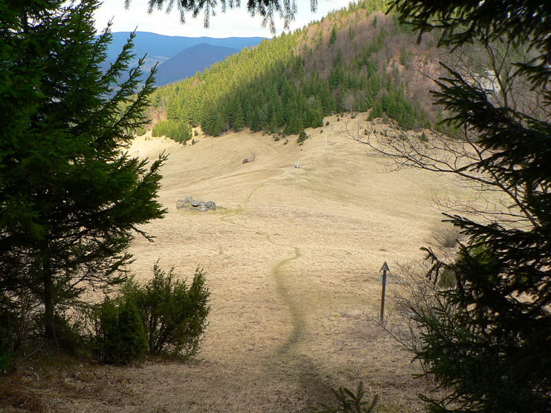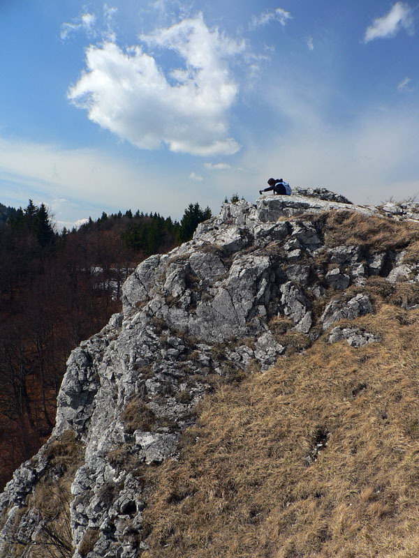 Samozrejme že napriek tomu vidieť vo svahu ľudí. Vraciame sa k nižšiemu rázcestiu (smerovník pod Rozsutcom) a pokračujeme po modrej, traverzom východného svahu Veľkého Rozsutca do sedla Medzirozsutce. Chodník vedie najprv pasienkami (parádne výhľady na východ), v druhej polovici lesom. Miestami je ešte nepríjemný ľad, poskrývaný pod hrubými nánosmi bukového lístia. Tesne pred vynorením z lesa na Medzirozsutcoch trčia vo svahu zaujímavé skalky a z nich je pekný pohľad na sedlo aj Malý Rozsutec. Na ten je výstup povolený, takže neváhame a o polhodinku už si vychutnávame kruhový výhľad z vrcholu. Spestrením je v oboch smeroch exponovaná skalná pasáž, zaistená reťazami, ale teraz v predjarí aj ľad v lese.