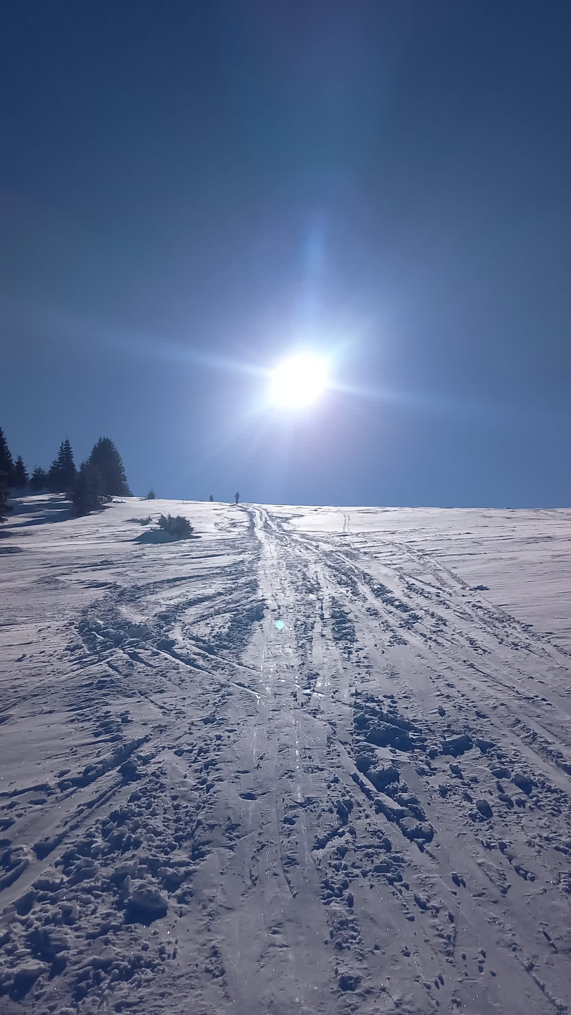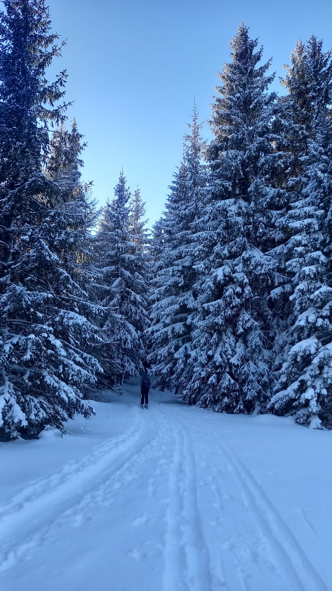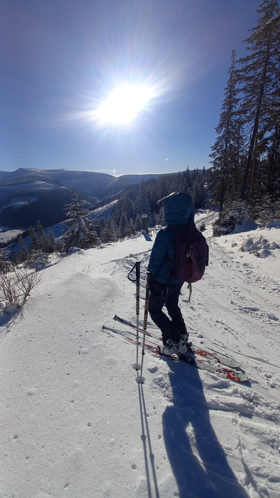 Nedávna víchrica tu narobila škody a okrem toho, že pováľala stromy, tak vyfúkala sneh až po trávu. Kúsok musíme ísť peši, kým opäť zapneme lyže. Potom už zlyžujeme po zjazdovke dole až ku autu.