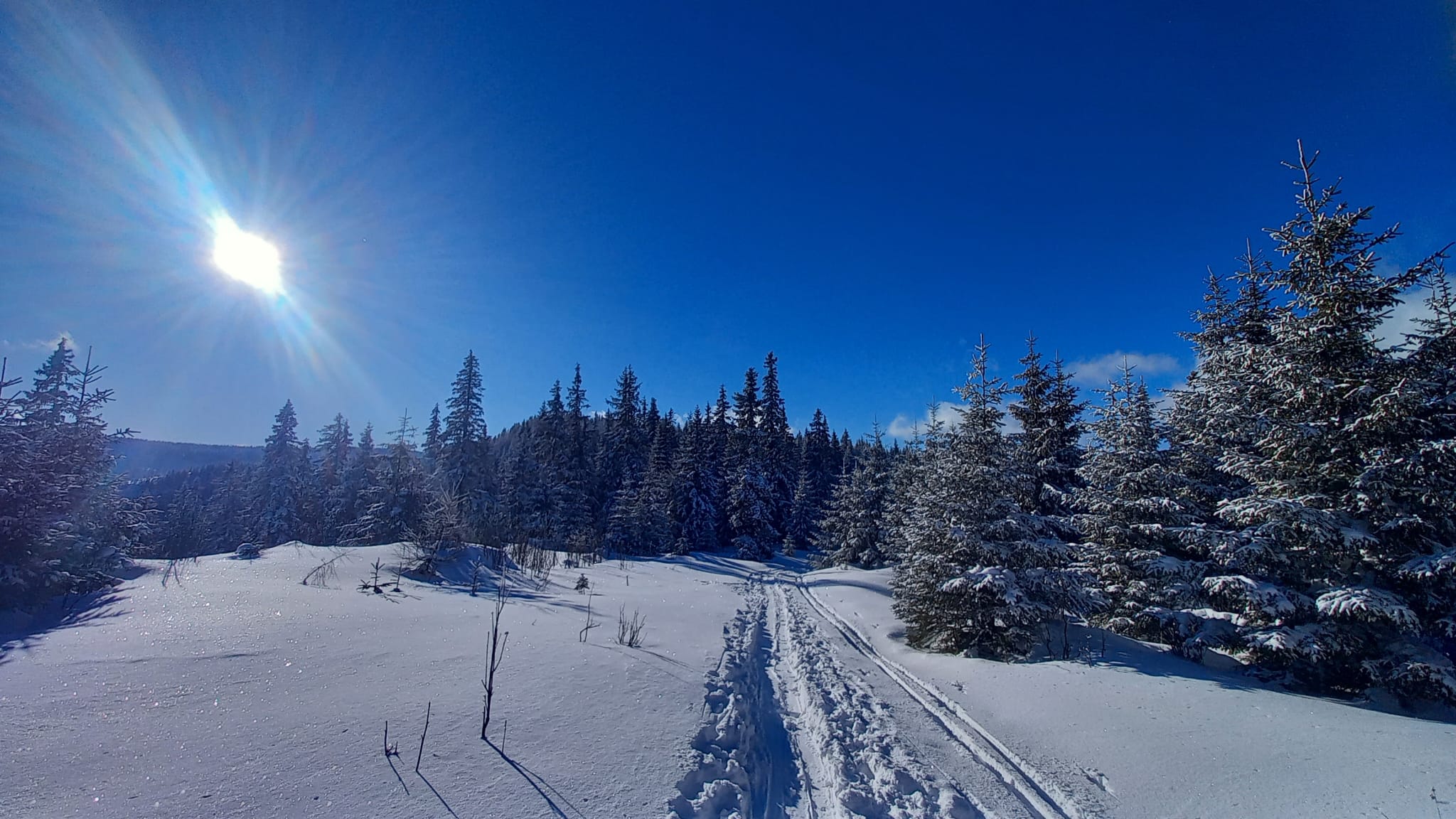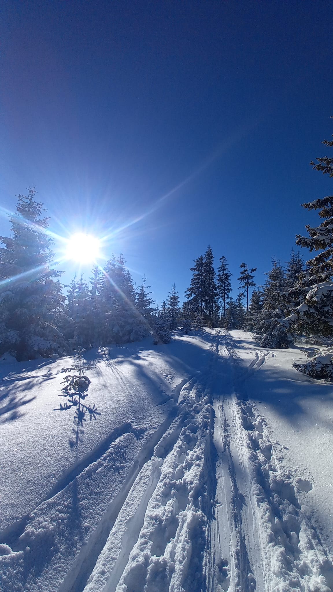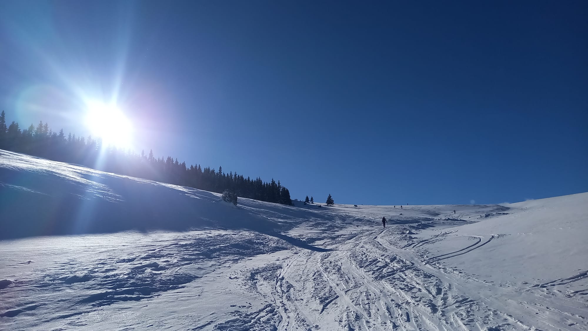 Nedávna víchrica tu narobila škody a okrem toho, že pováľala stromy, tak vyfúkala sneh až po trávu. Kúsok musíme ísť peši, kým opäť zapneme lyže. Potom už zlyžujeme po zjazdovke dole až ku autu.