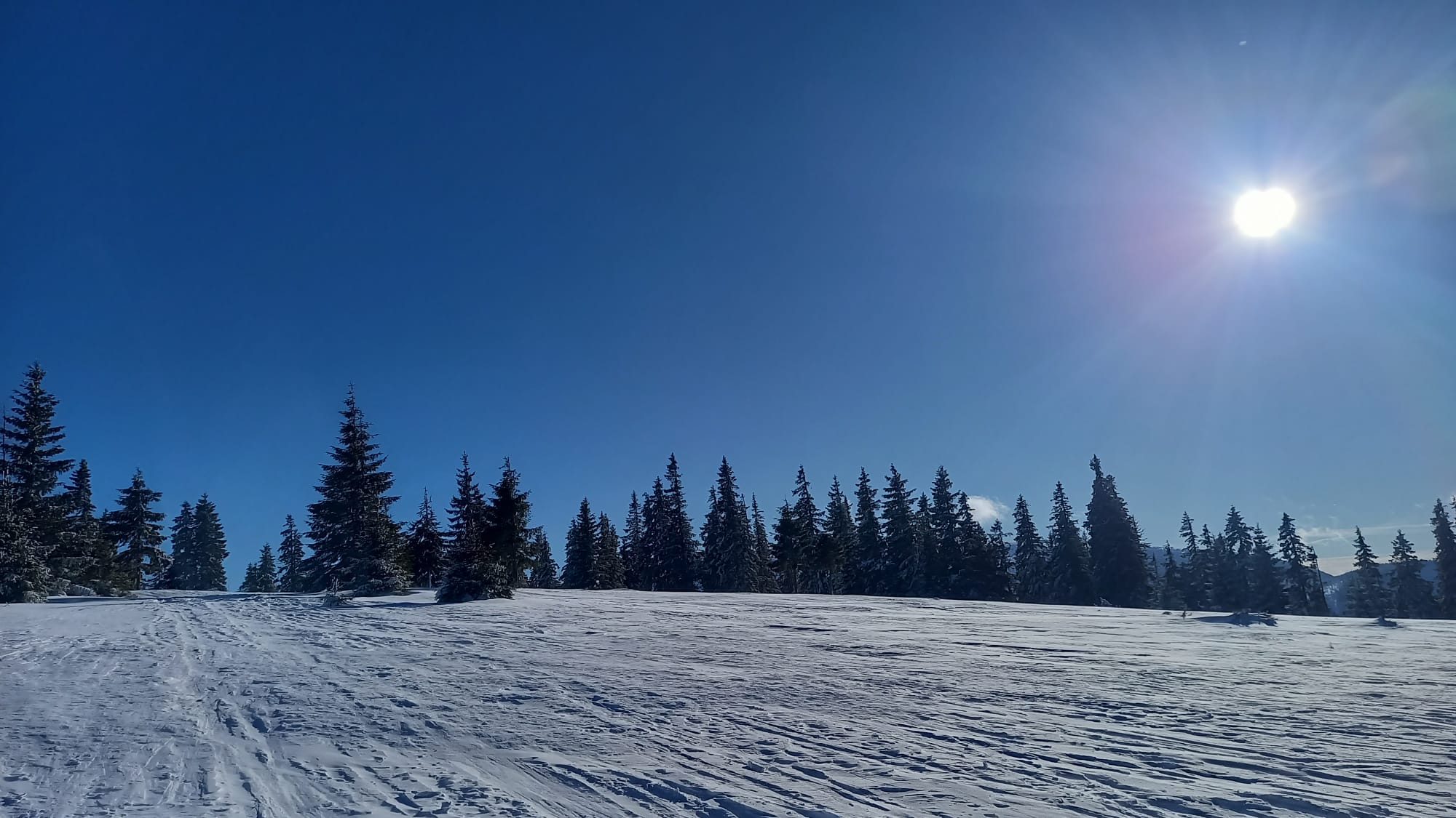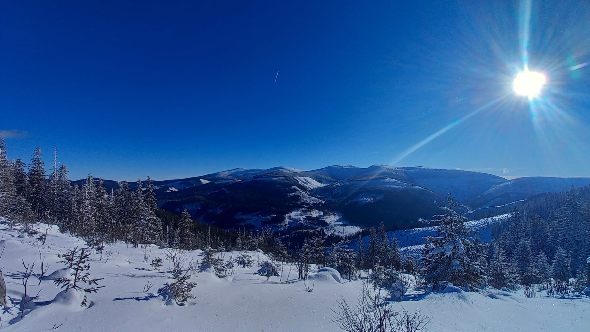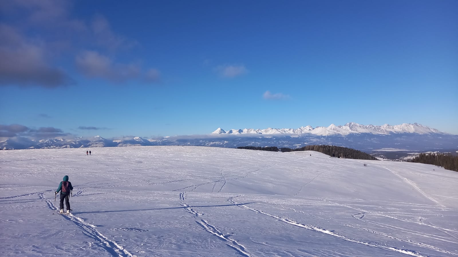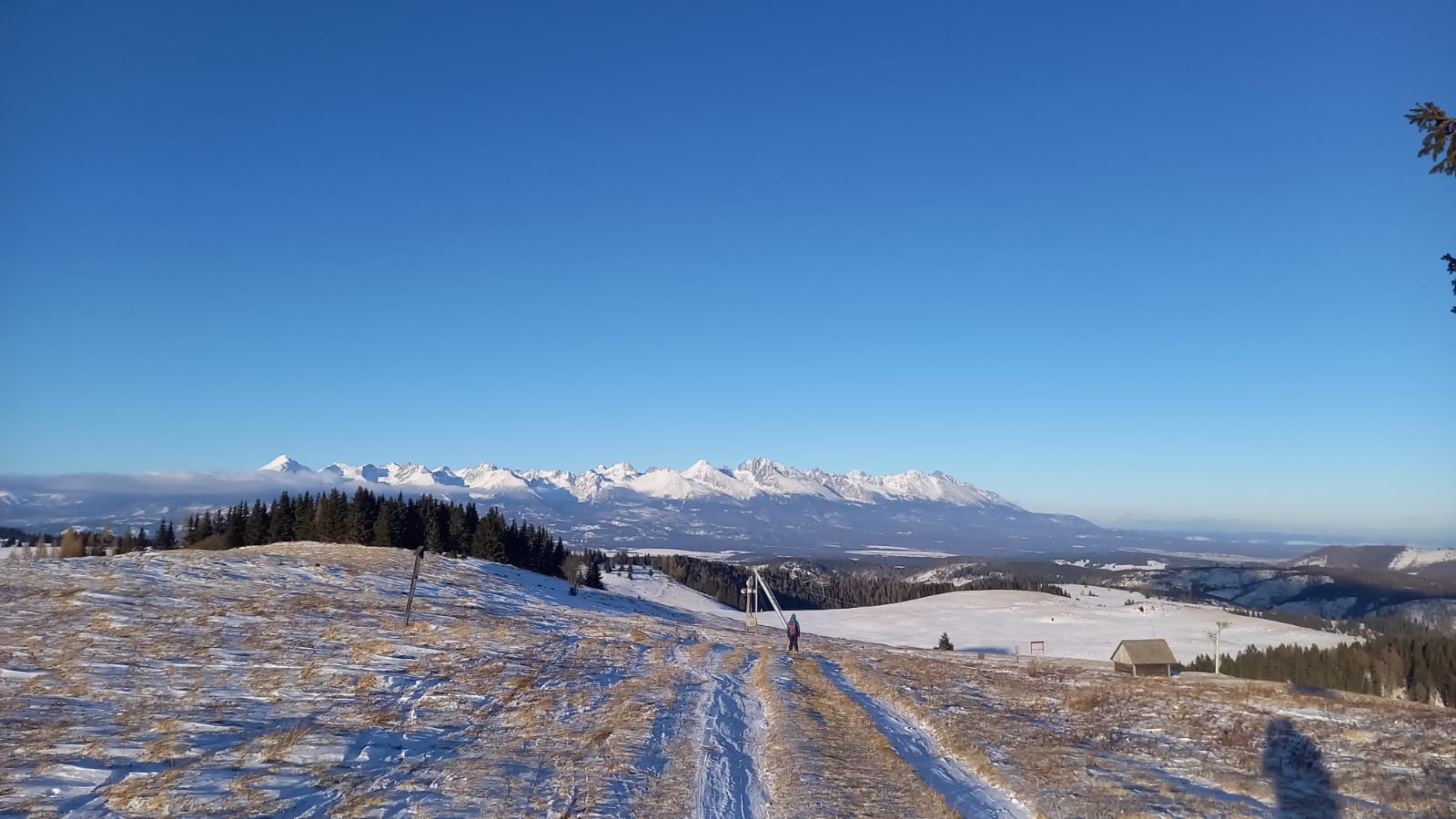 Pri východe z lesa na lúky je snehu dosť, nadmorská výška je tu ako na Štrbskom plese. Z Panskej hole sa dá šliapať ďalej po žltej značke, hrebeňom až ku chatke Budnárka. Otáčame ale kúsok skôr a po lúkach ideme až na Smrečiny ku hornému koncu vleku.