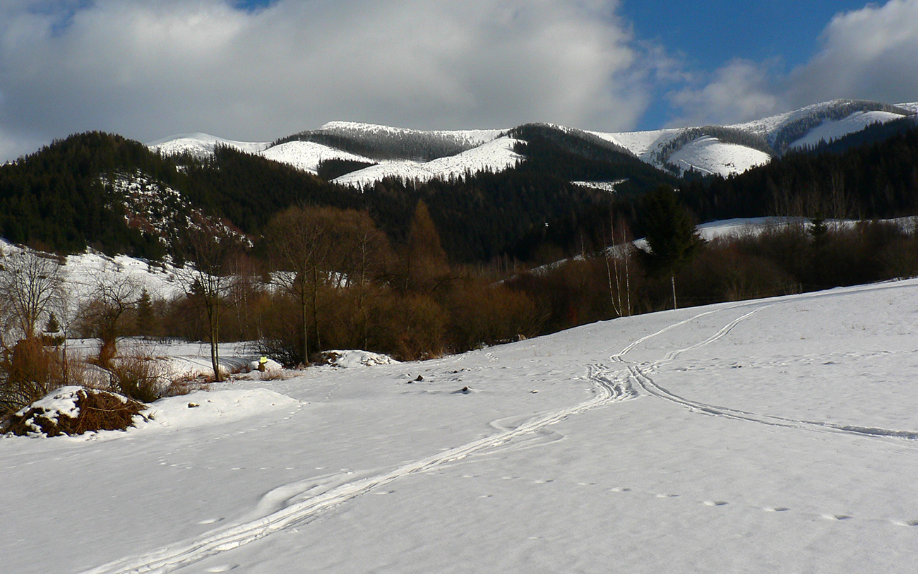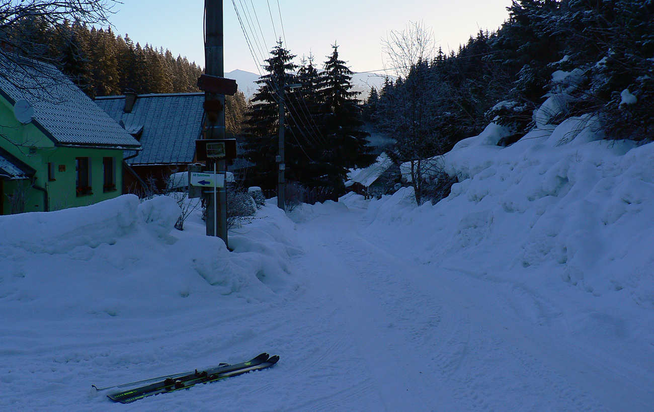 Začal som z Donovalov, ale nie z centra a netradične dole kopcom – z busu som vyskočil „pod Magurou“ a popri miestnom zbernom dvore a čističke som vybehol na Mistríky, s lyžami v rukách. Odtiaľ už dole pomedzi domy a lesom prepekná cestička až do doliny, ktorou som sa vyplazil k útulni pod Kečkou. Chvíľku ma aj medvedie stopy viedli :-) Samozrejme som zabudol zapnúť hodinky, ale toto trafí každý a do doliny sa dá nastúpiť aj z auta od hlavnej cesty.