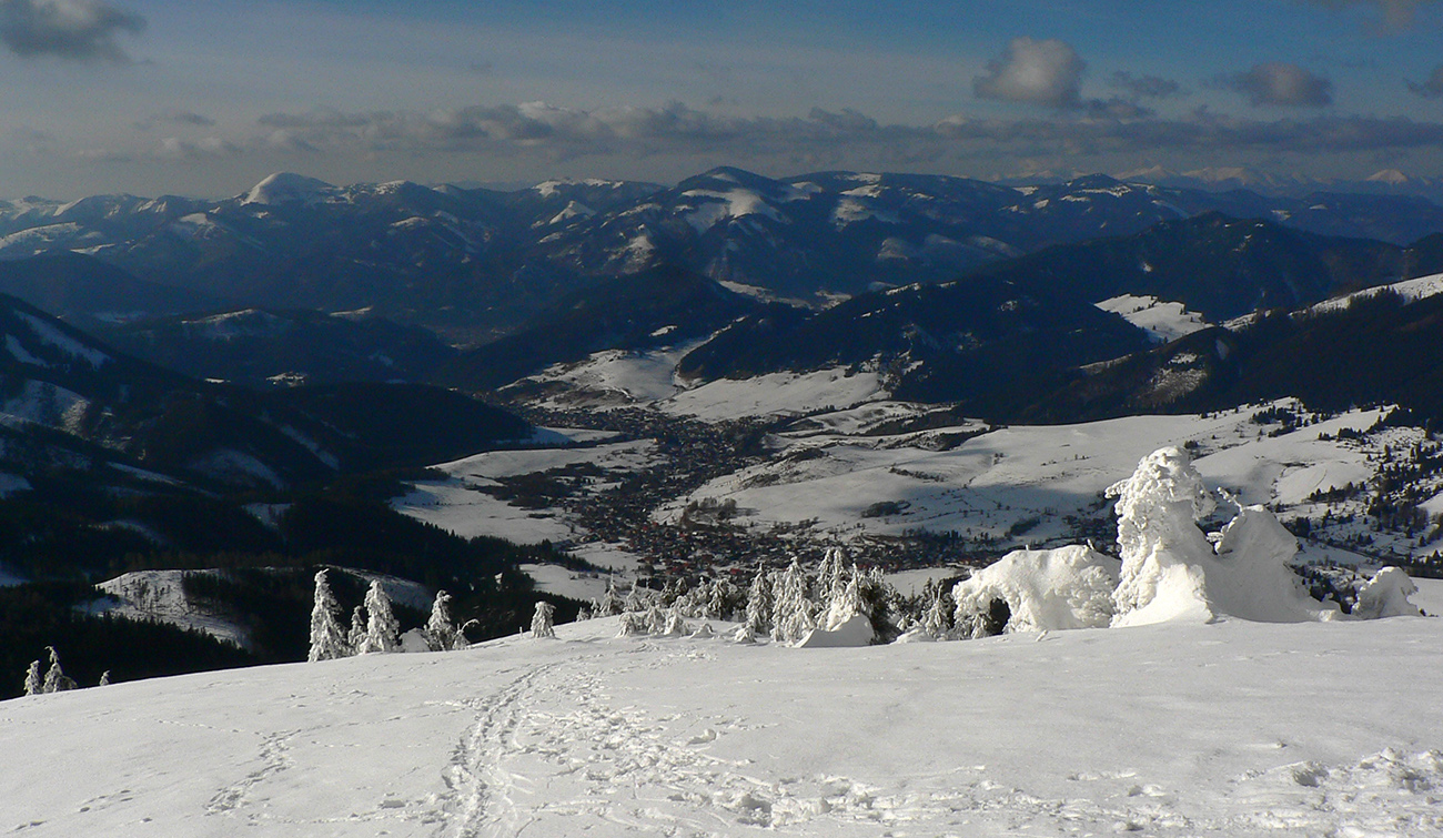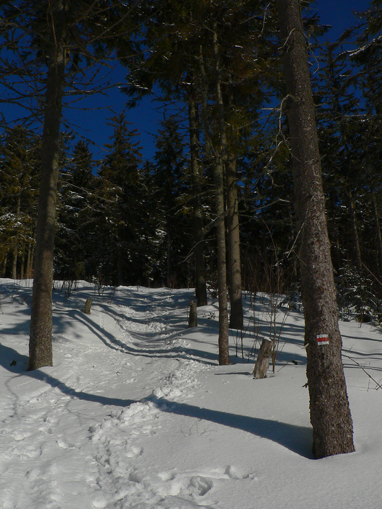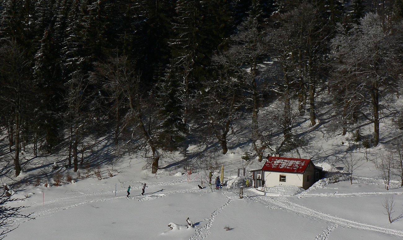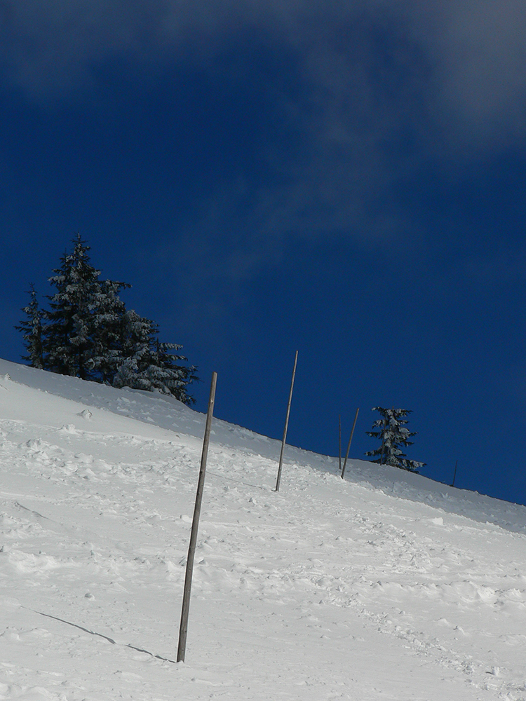 No a záver – už len do Lúžnej sa doplaziť voľajako... Tak ešte traverz popod Veľkú Chochuľu a Košarisko, krížom cez ďalšie oblúkmi pokreslené muldy a svahy, ktoré síce lákali, ale času už nebolo. V sedle pod Košariskom pásy dole. Chvíľa rýchla po vytvrdenom hrebeni, potom tri chvíle bežkovania, palicovania a korčuľovania v snahe dostať sa bez pásov do sedla pod Skalkou. Skoro sa mi to podarilo, ale nového snehu v nižších polohách pribúdalo a vlhol. Tak ešte posledné naliepanie na krátkych pár minút mierne do kopca, aby som sa na žltú dostal, a potom už popri kríži a po rúbaniskách „rýchlo a zbesilo“ dole. Inak celkom dobré lyžovanie by to bolo – lebo tvrdo, ale nie ľadovo, v lesíku pod krížom aj prašanové záveje. Ale čas odchodu autobusu sa blížil a či dolyžujem až do dediny, to som netušil.