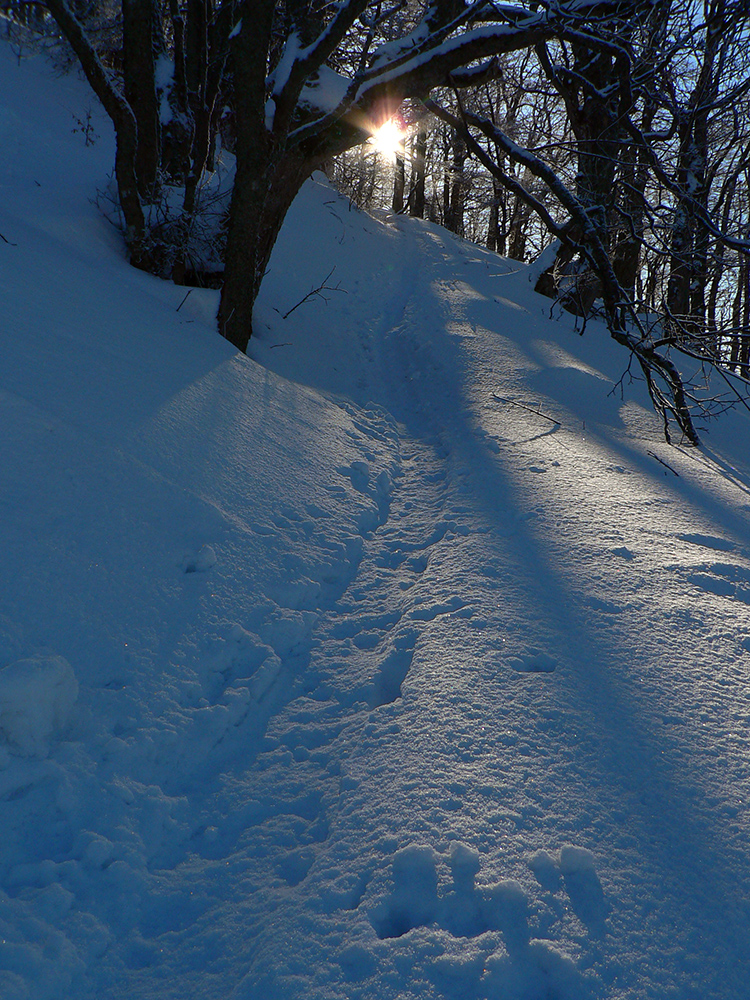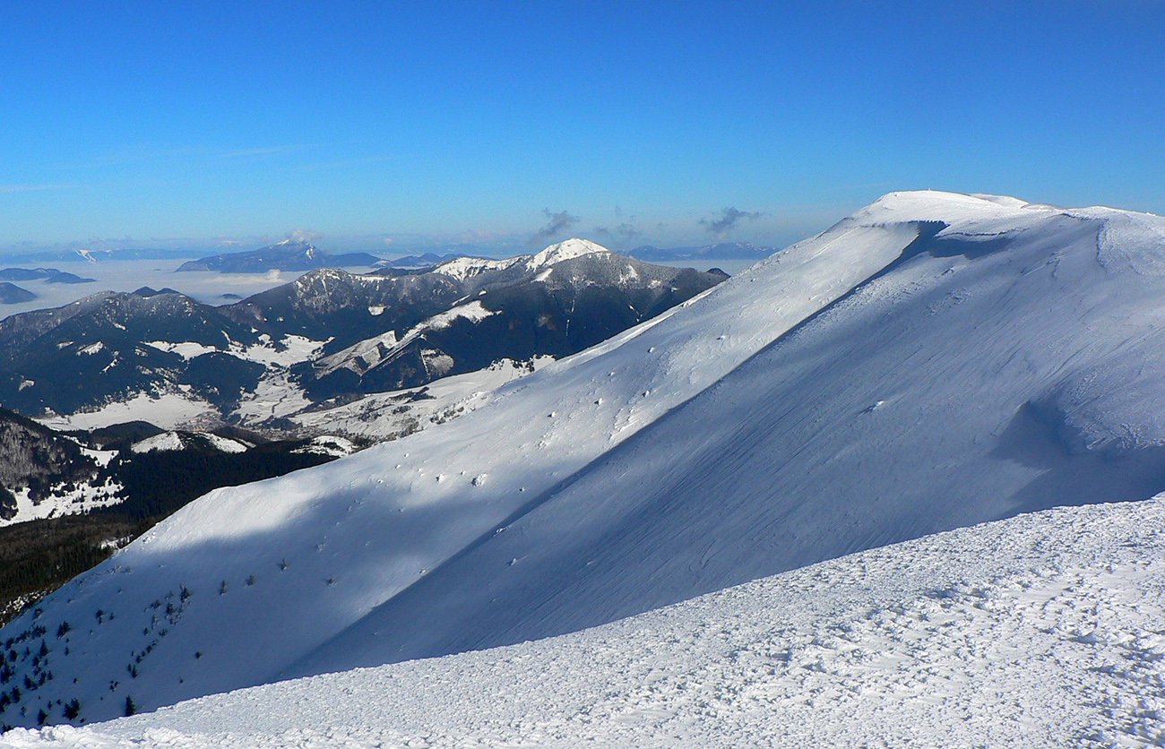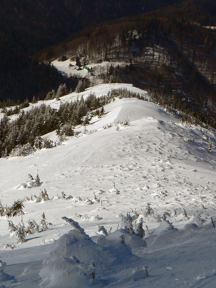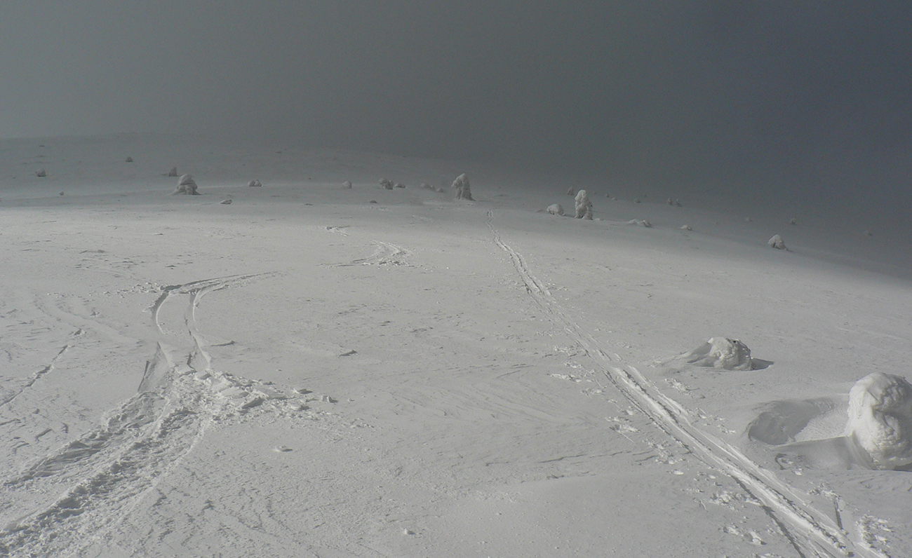 Po arktickom počasí sa zase dovalil hnusný odmäk, no prvé dni ešte vo vyšších polohách moc neuškodil. Naopak – aj dobre spravil, keď prilepil k zamrznutému podkladu nový sneh. Šialená zima, ako na hojdačke... Ale čo už. Šiel som teda vyskúšať tie vyššie polohy masívu Prašivej. Mal som viac variantov „denného programu“ podľa toho ako nohy pôjdu. Rýchlo sa ukázalo, že nejdú vôbec, tak som to nehnal po hrebeňovke, ale ostal som tam polyžovať. A dobre som spravil a nebol som sám – na starom ľade taká hutná, vetrom a už aj slnkom ubitá vrstva nového snehu, do 10 cm. To na juh. Od hrebeňa až do lesa takmer žiadny ľad. Len na hrebeni miestami trochu tvrdšie šindle, strungy, kto to už ako volá. Severy samozrejme tvrdé, vyfúkané, hrboľaté, tam som ani nešiel. Ale po nedávnom lavínovom poplachu ani stopy.