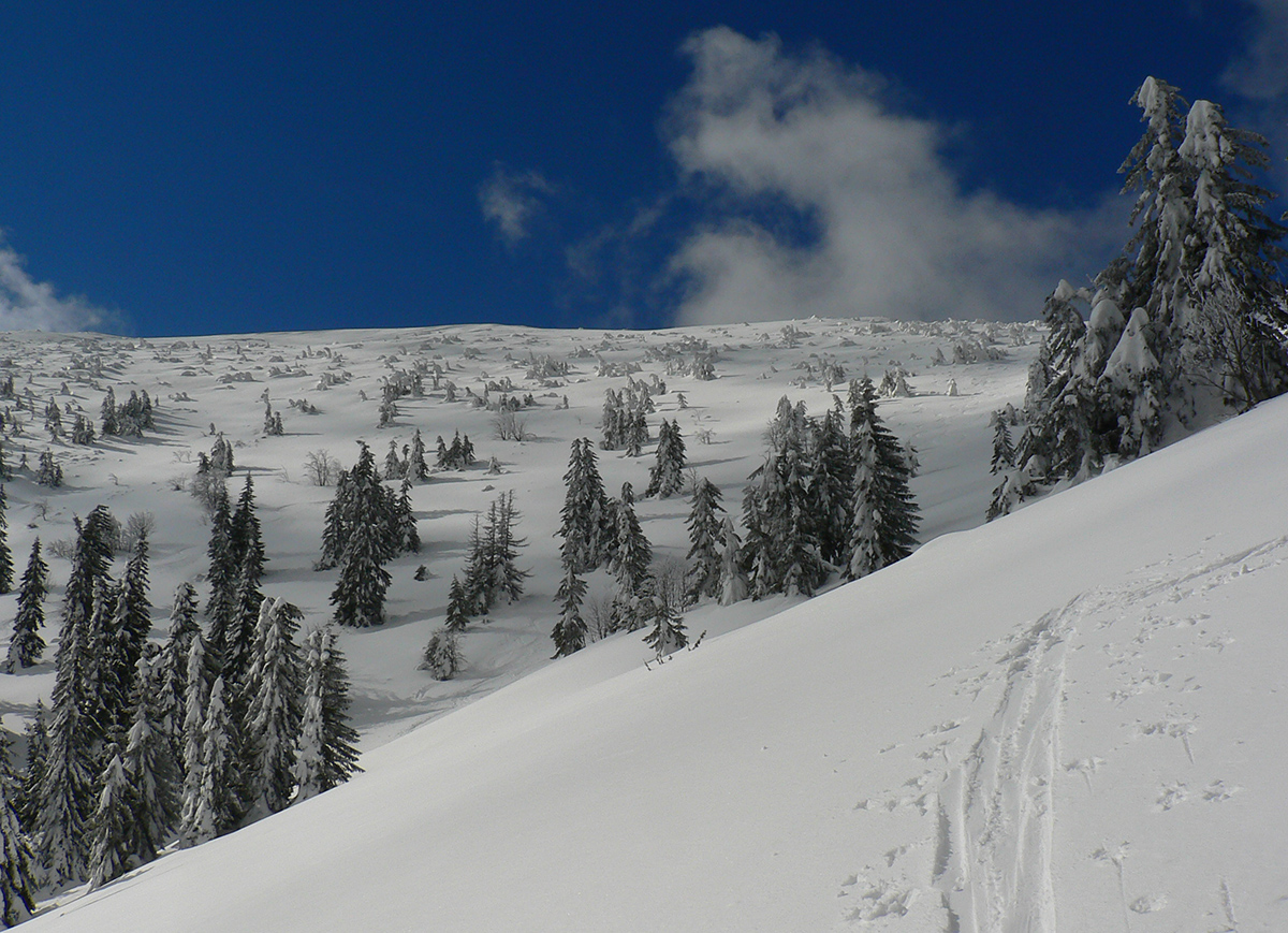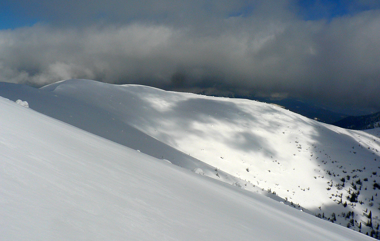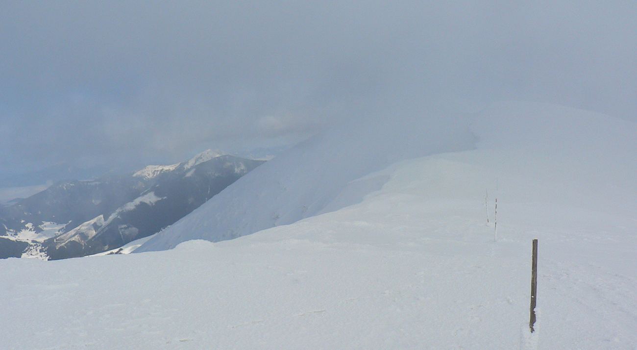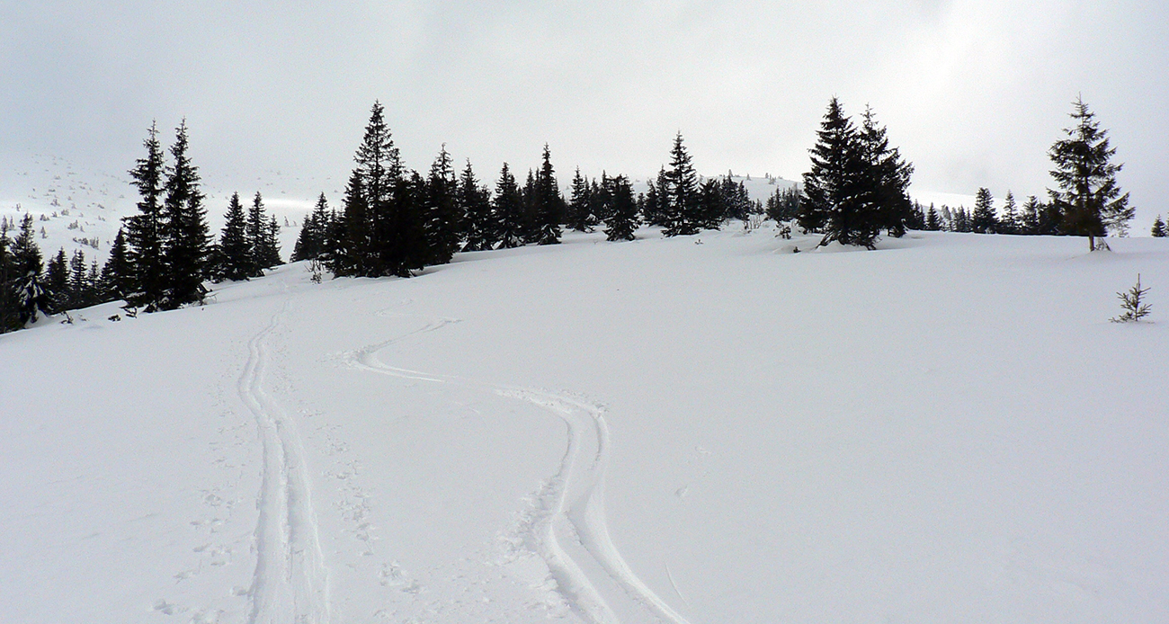 Potom nad lesom už paráda. Sneh akurát držal, ale nelepil, zo zadekovaných dolín aj dáke tie hmly vybehli na hrebeň, nebolo bárs horúco a viditeľnosť parádna. Tak som si „z výkladu“ ako prvé vybral juhovýchodné rebro Malej Chochule. Až dole po les úplná paráda. Kompaktný, rovný povrch, ani prašan, ani kašan, kôrka žiadna, len úplne dole už sneh trochu navlhnutý.