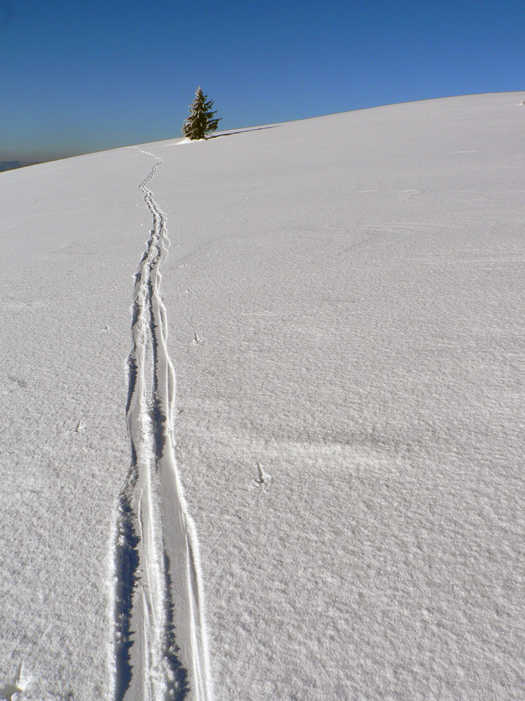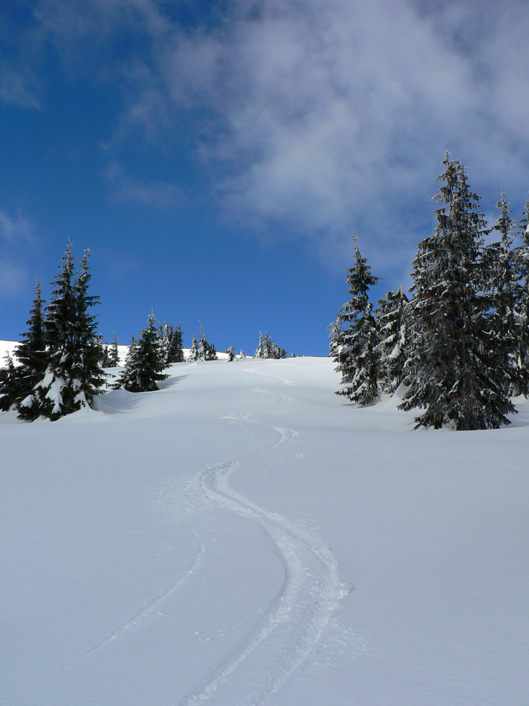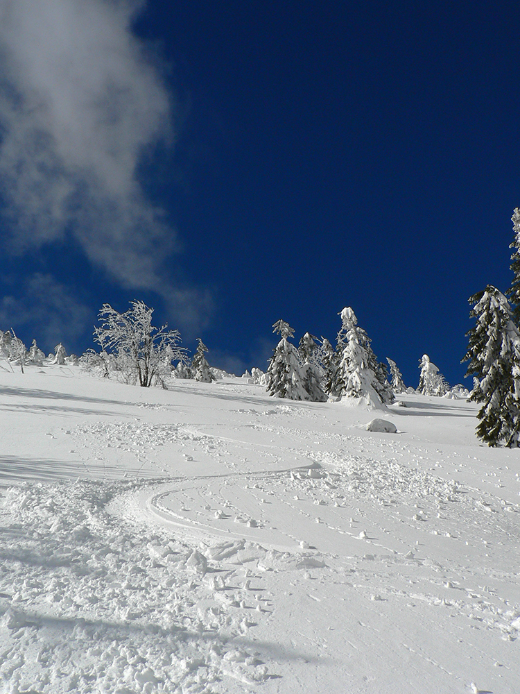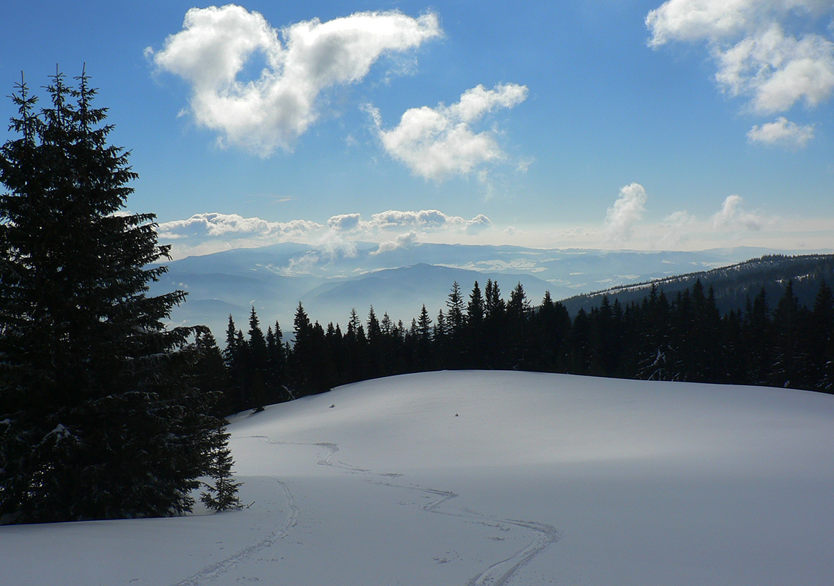 Potom nad lesom už paráda. Sneh akurát držal, ale nelepil, zo zadekovaných dolín aj dáke tie hmly vybehli na hrebeň, nebolo bárs horúco a viditeľnosť parádna. Tak som si „z výkladu“ ako prvé vybral juhovýchodné rebro Malej Chochule. Až dole po les úplná paráda. Kompaktný, rovný povrch, ani prašan, ani kašan, kôrka žiadna, len úplne dole už sneh trochu navlhnutý.