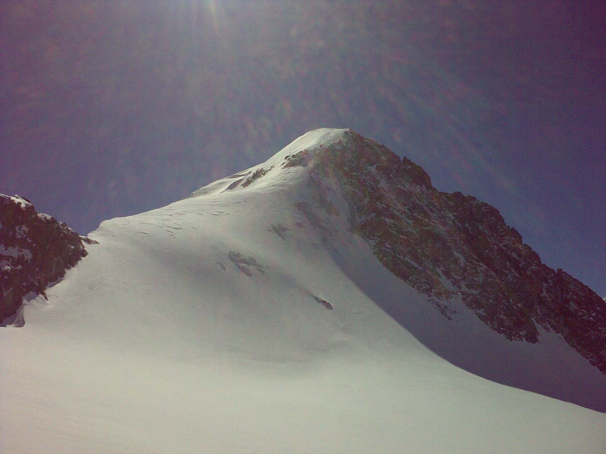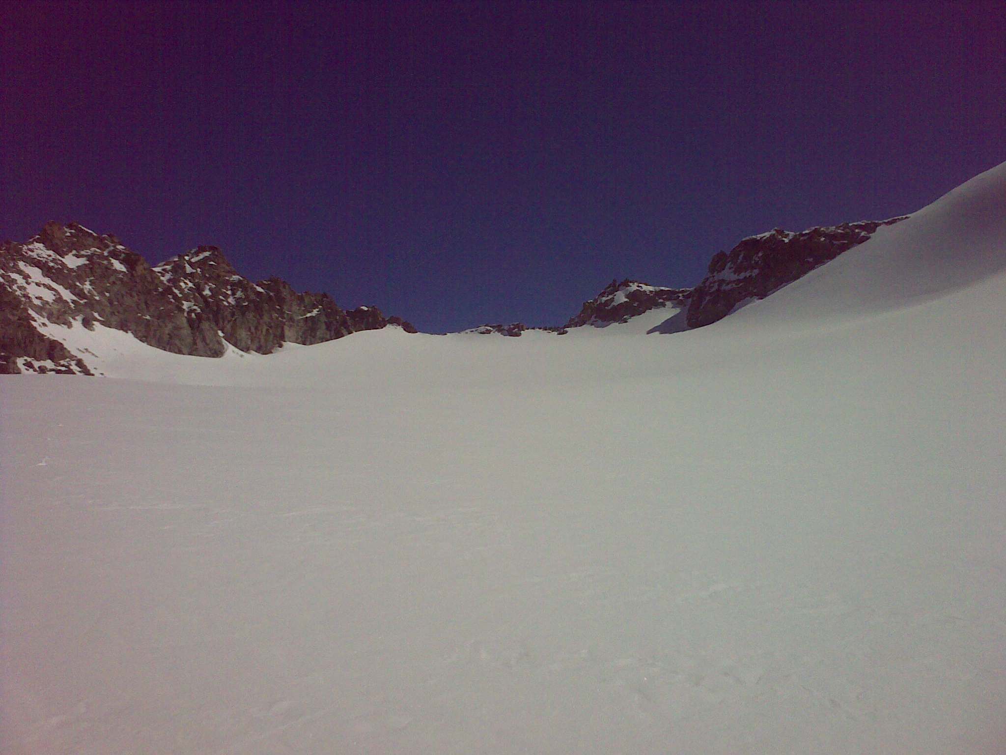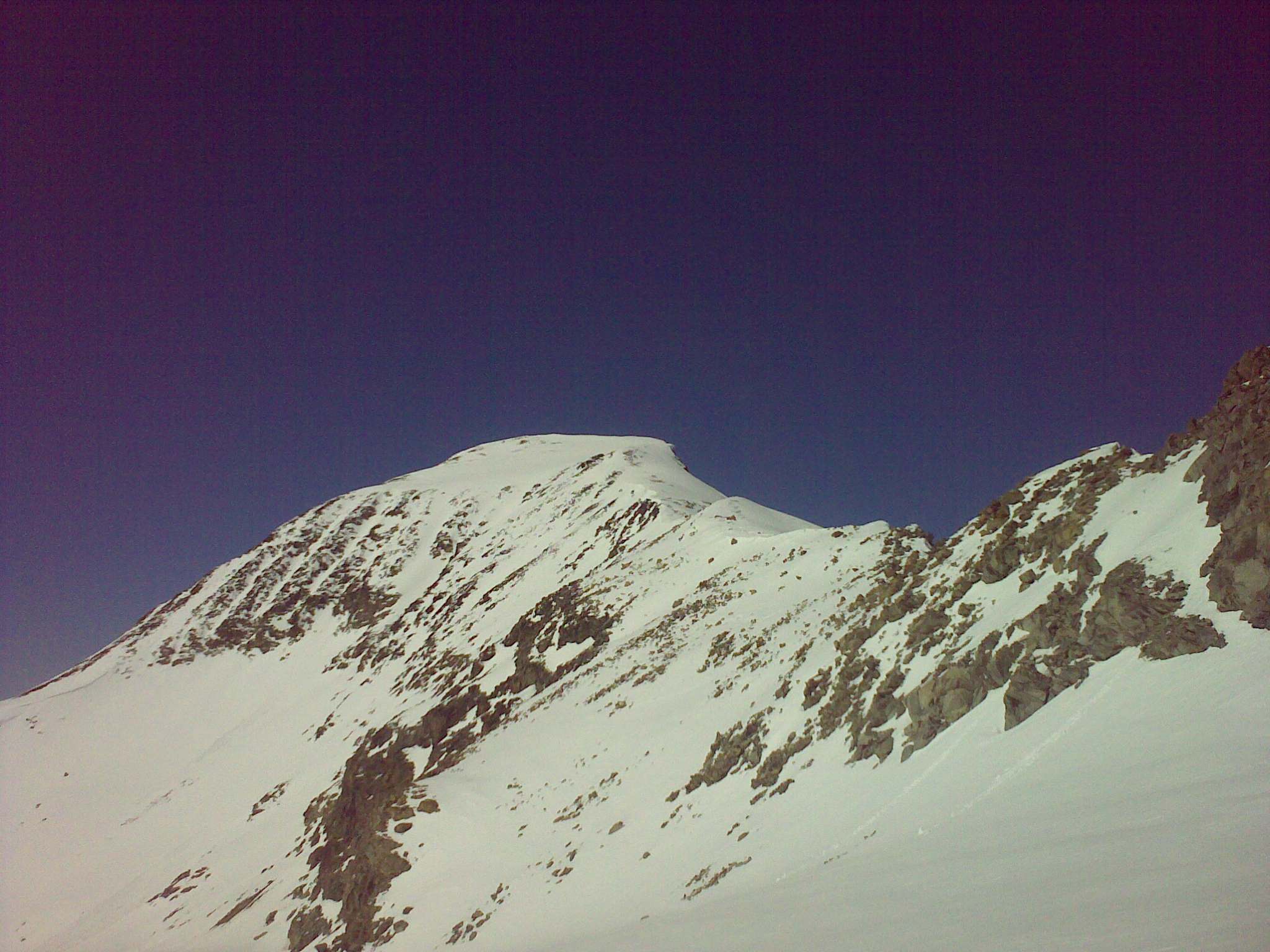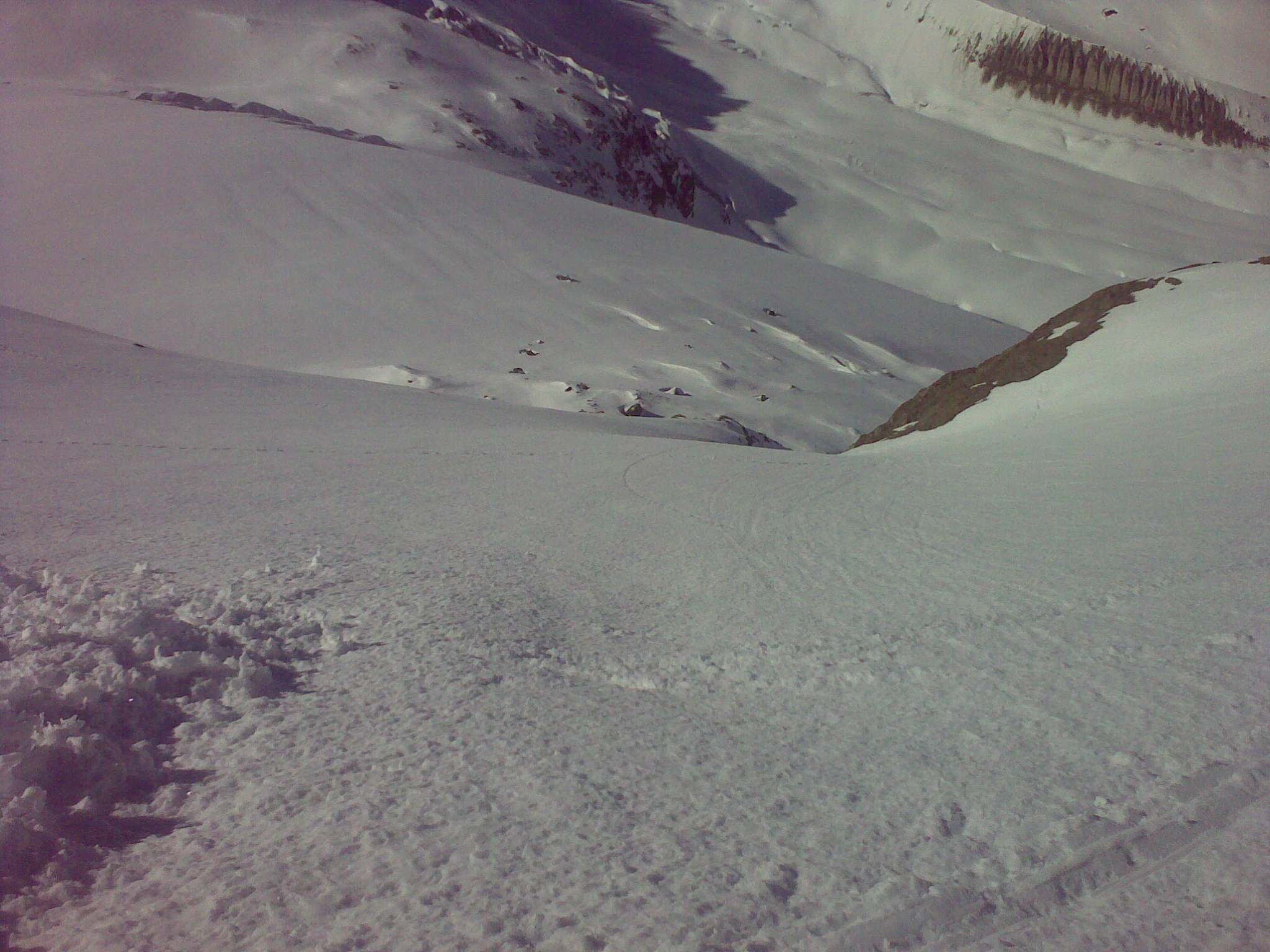 Ja som sa bez mačiek dostal len kúsok ďalej zo sedla smerom k Piz Morteratch. Asi 200 výškových metrov pod vrcholom je to už vyfúkané a ľadové. Takže treba aj mačky, ktoré som nemal. Spravil som pár fotiek, odlepil pasy a naspäť dole. Protiľahlý vrchol Piz Tschierva vyzeral oveľa lepšie, tak som si ešte vyšliapol tam, nech to stoji za to. Najlepšie je začať stúpať kúsok pred koncom ľadovca, vľavo hore. Dostanete sa do sedielka, z ktorého je už vidieť Val Roseg a odtiaľ po hrebeni je to už len kúsok. Je tam veľa veľkých kameňov a miestami vyfúkané, tak je lepšie v sedielku nechať aj lyže. Hore bolo úplné bezvetrie a počasie na krátky rukáv. Pri zostupe som mal mierne obavy, ako sa bude správať ten strmý svah nad Tschierva Hütte, ale bolo to v pohode...nádherná lyžovačka v jarnom firne.