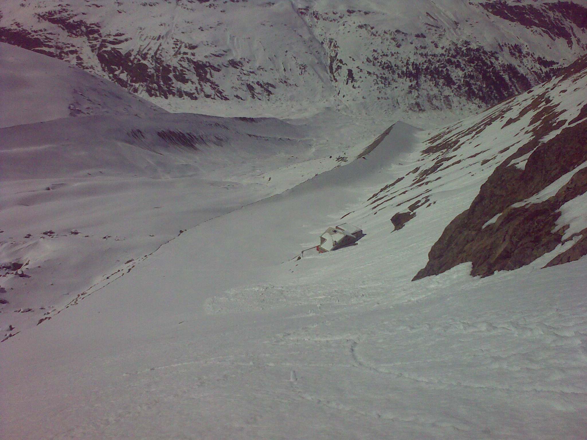 Od chaty vedie strmý svah, ktorý bol celý zamrznutý, takže „haršajzne“ treba mat stále zo sebou. Kúsok pred nástupom na ľadovec je tam jedno kľúčové miesto, ktoré je v lete riešené rebríkmi, teraz tam bola zosypaná lavína. Cez lavínište sa dalo v pohode vyšplhať s lyžami v rukách. Ďalej je to bez väčších problémov až k ľadovcu. Na ľadovci je už len mierne stúpanie a je to taký skialpový relax. Ľadovec je obklopený zo všetkých strán vrcholmi. Vpravo Piz Morteratsch 3751 m.n.m. a vľavo Piz Tschierva 3546 m.n.m. a priamo pred vami sedlo, cez ktoré sa dá dostať k Boval Hütte.