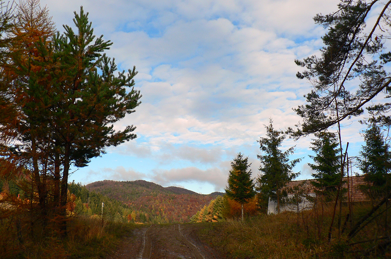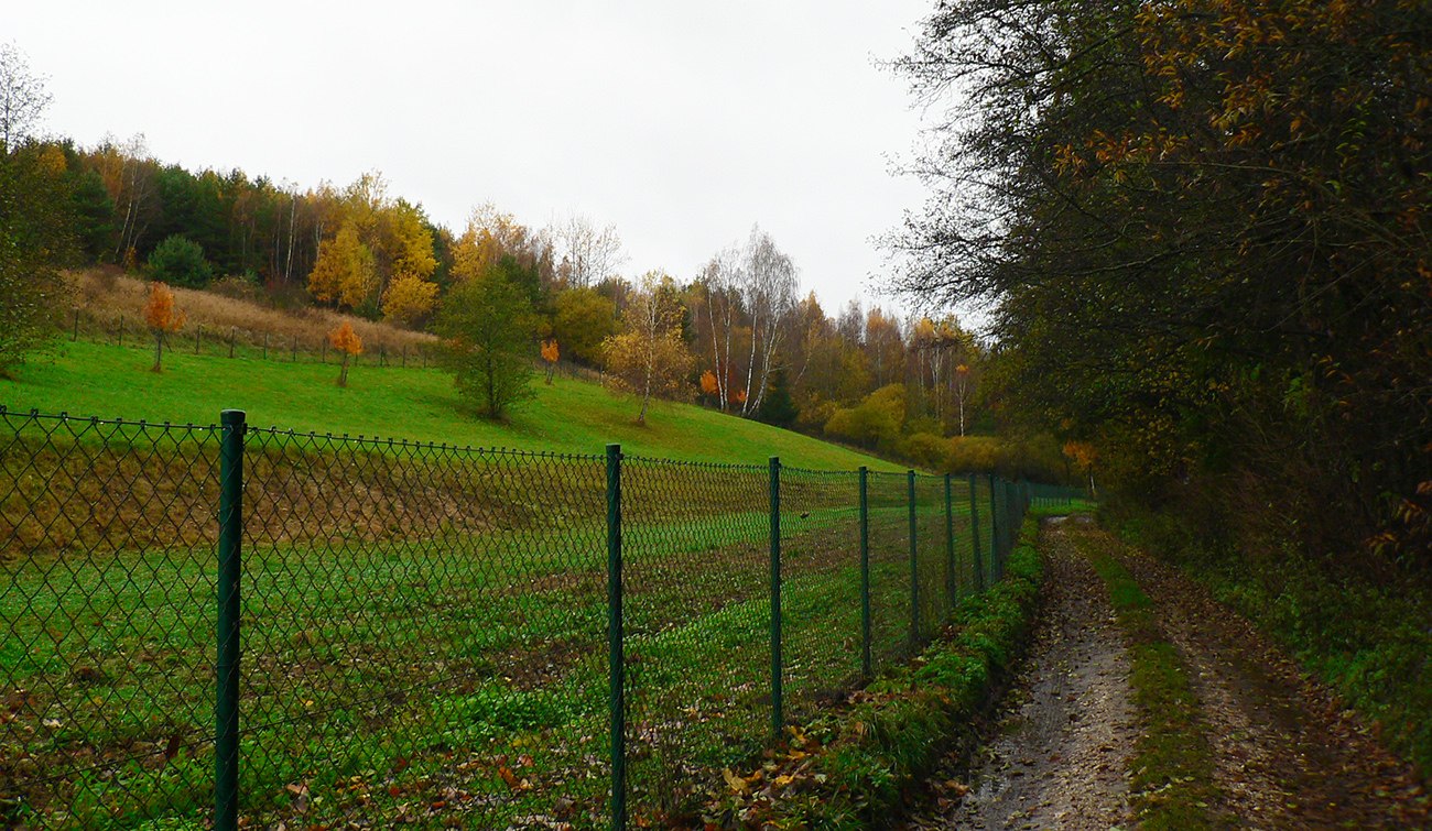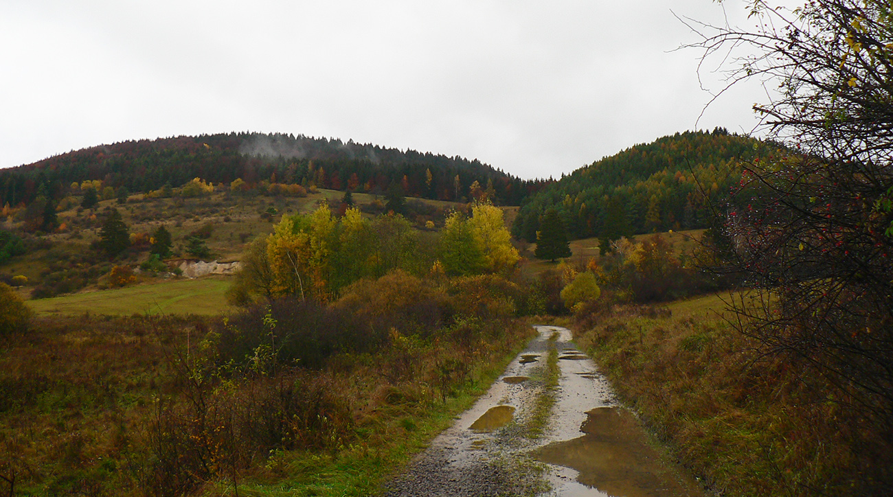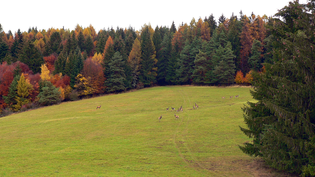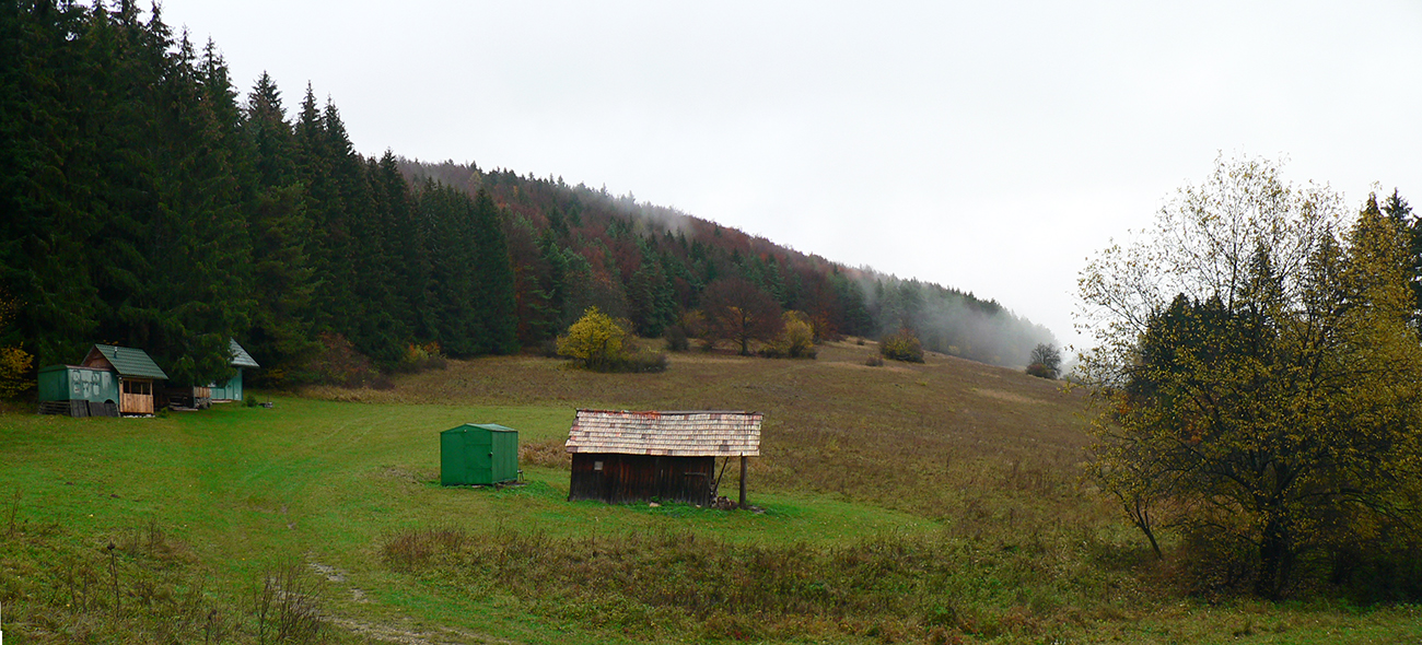 Nazad na červenú som sa dostal na tej istej lúke, na ktorú som ráno vyliezol z doliny. Ale tentokrát ma nelákala cesta nazad do Rudna po dne doliny (veľa mlák na ceste), skúsil som radšej po bočnom hrebeni, cez lúku, kde som ráno fotil tie jelenice. Cesta cez lúku (paralalná s tou dolinovou) bola OK, ale v lese rýchlo zanikla. Nevadilo, prerazil som lesom cez vrchol Vlčej (753 m), poplašil som posledné stádo, tento raz poriadne (aspoň 50 kusov), strmo som zbehol čerstvým rúbaniskom a vynoril som sa znovu na lúkach nad plechovým „družstevným senníkom“, kde som bol už dvakrát. A to už bolo do dediny na skok. Veď bolo aj načase - už sa začalo šeriť. No čo by som chcel, že? Zimný čas a krátko po štvrtej, posledný deň októbrový.