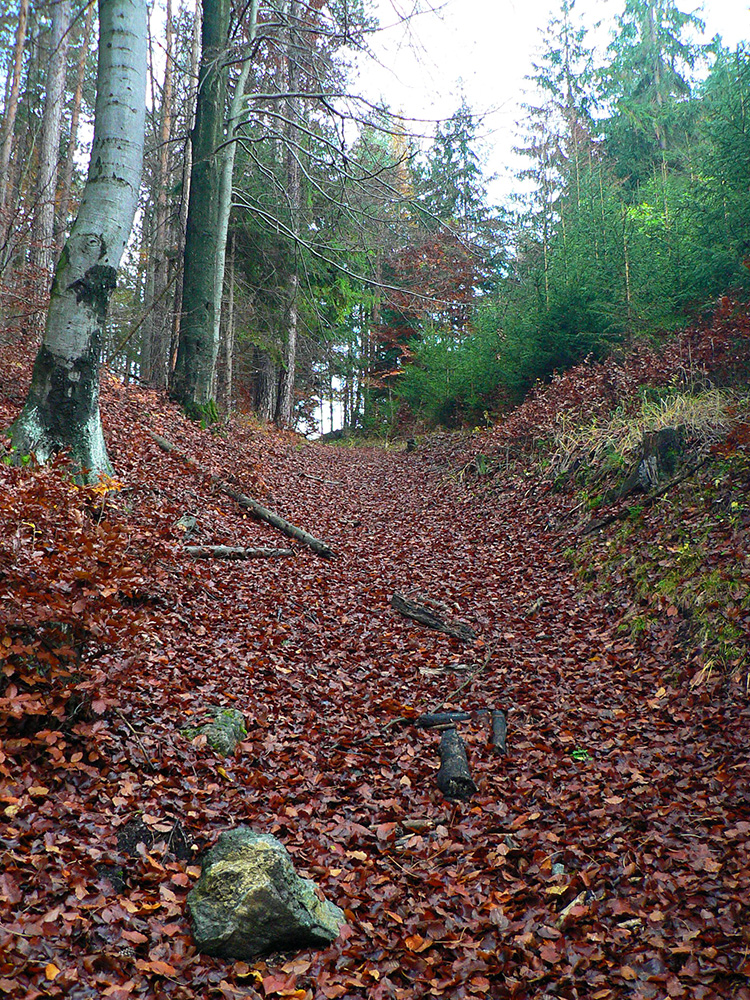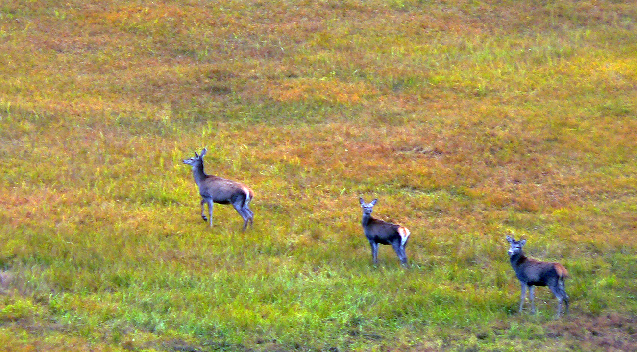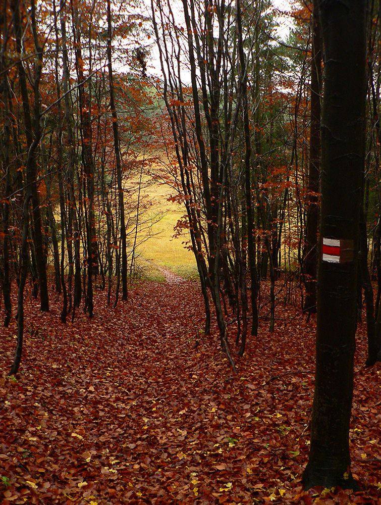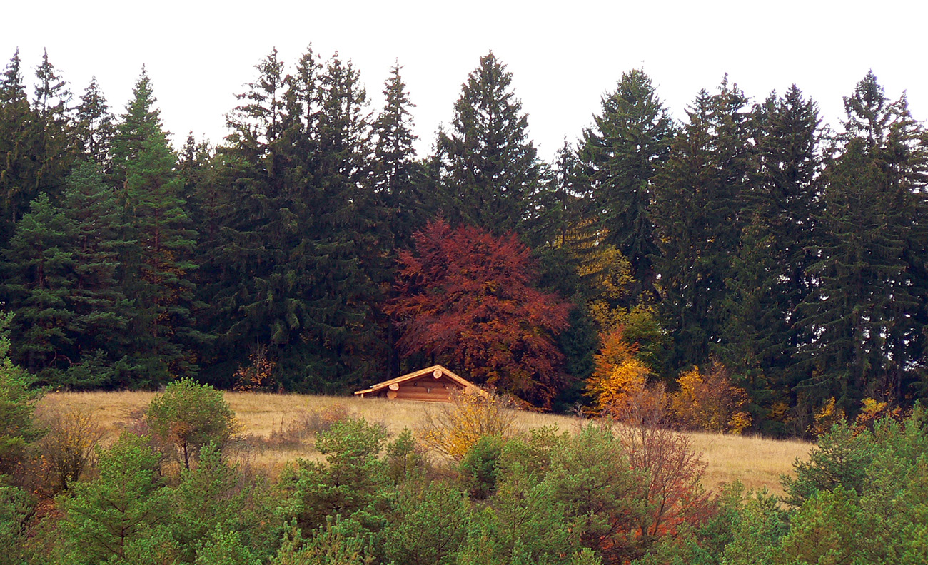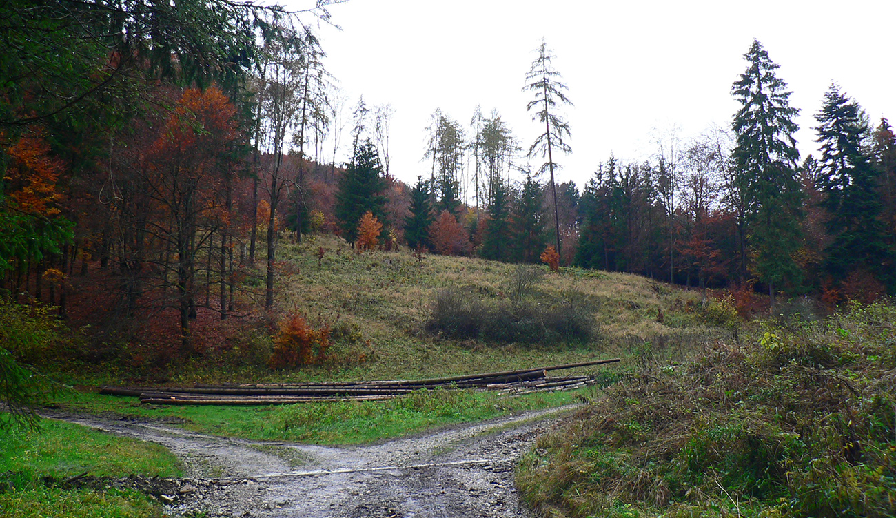 Nazad na červenú som sa dostal na tej istej lúke, na ktorú som ráno vyliezol z doliny. Ale tentokrát ma nelákala cesta nazad do Rudna po dne doliny (veľa mlák na ceste), skúsil som radšej po bočnom hrebeni, cez lúku, kde som ráno fotil tie jelenice. Cesta cez lúku (paralalná s tou dolinovou) bola OK, ale v lese rýchlo zanikla. Nevadilo, prerazil som lesom cez vrchol Vlčej (753 m), poplašil som posledné stádo, tento raz poriadne (aspoň 50 kusov), strmo som zbehol čerstvým rúbaniskom a vynoril som sa znovu na lúkach nad plechovým „družstevným senníkom“, kde som bol už dvakrát. A to už bolo do dediny na skok. Veď bolo aj načase - už sa začalo šeriť. No čo by som chcel, že? Zimný čas a krátko po štvrtej, posledný deň októbrový.