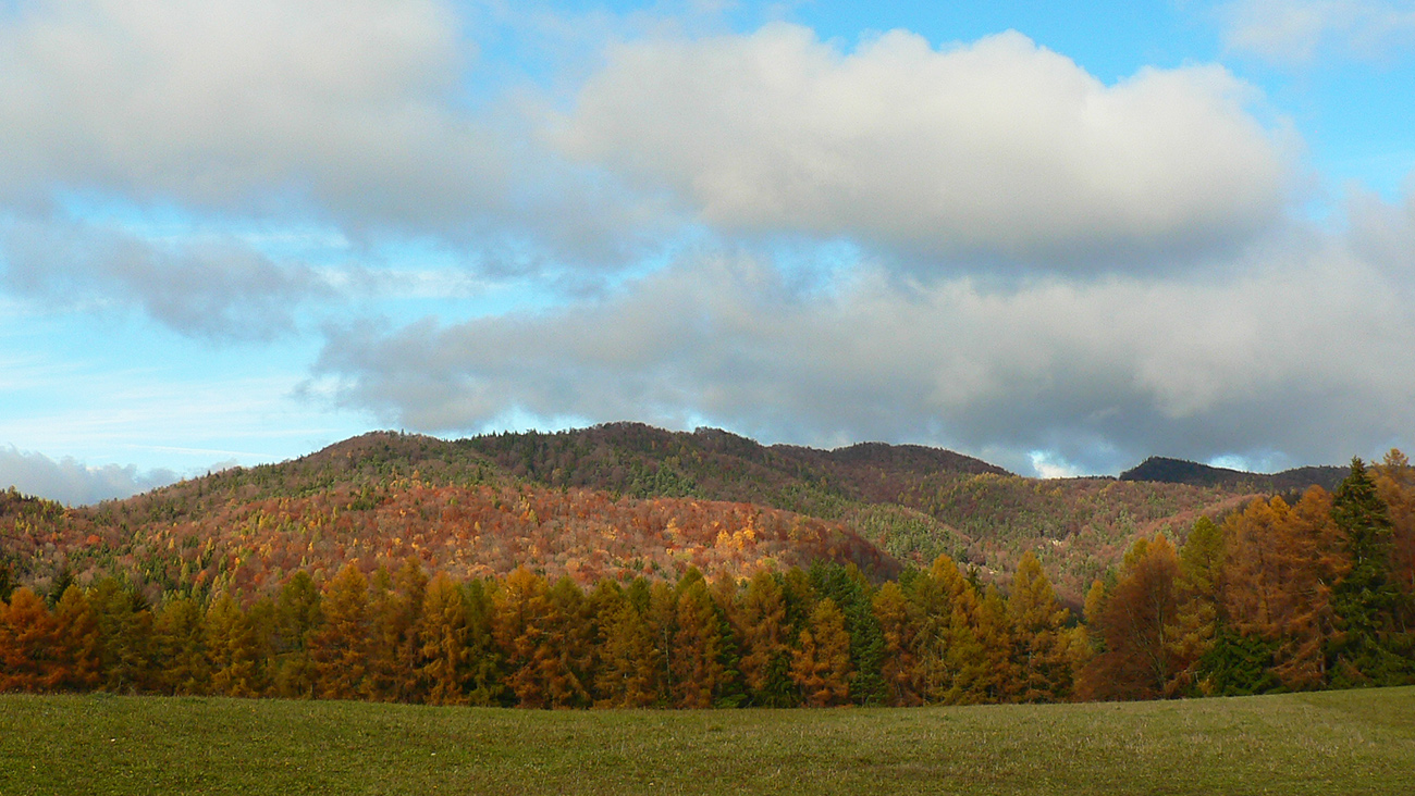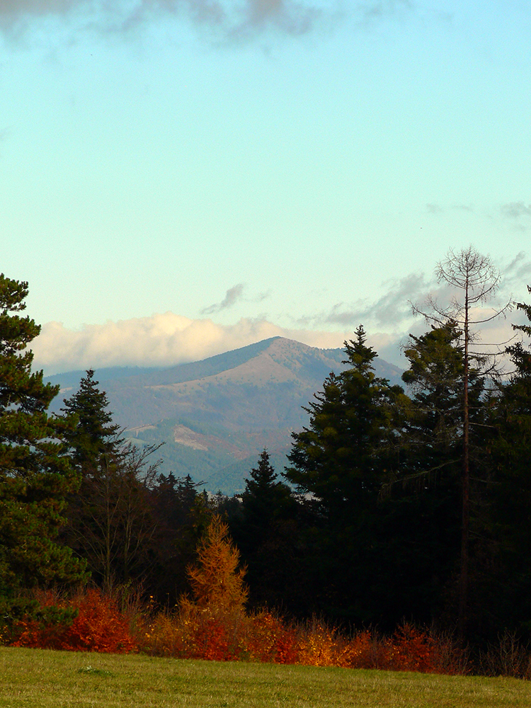 Vyšlo to tak, že jednou som šiel tam a druhou som sa vrátil. Tá viac vľavo ma doviedla ku starému ovocnému sadu, tá druhá je prístup k novej poľovníckej chate. Nooo, parádny výhľad si páni jágri zariadili. Ponad Rudno do kotliny, až k Veľkej Fatre. Nad ktorou sa inak už začala sivota trhať a modrá začala presvitať. Možno z tých jesenných farieb dnes predsa len niečo bude...