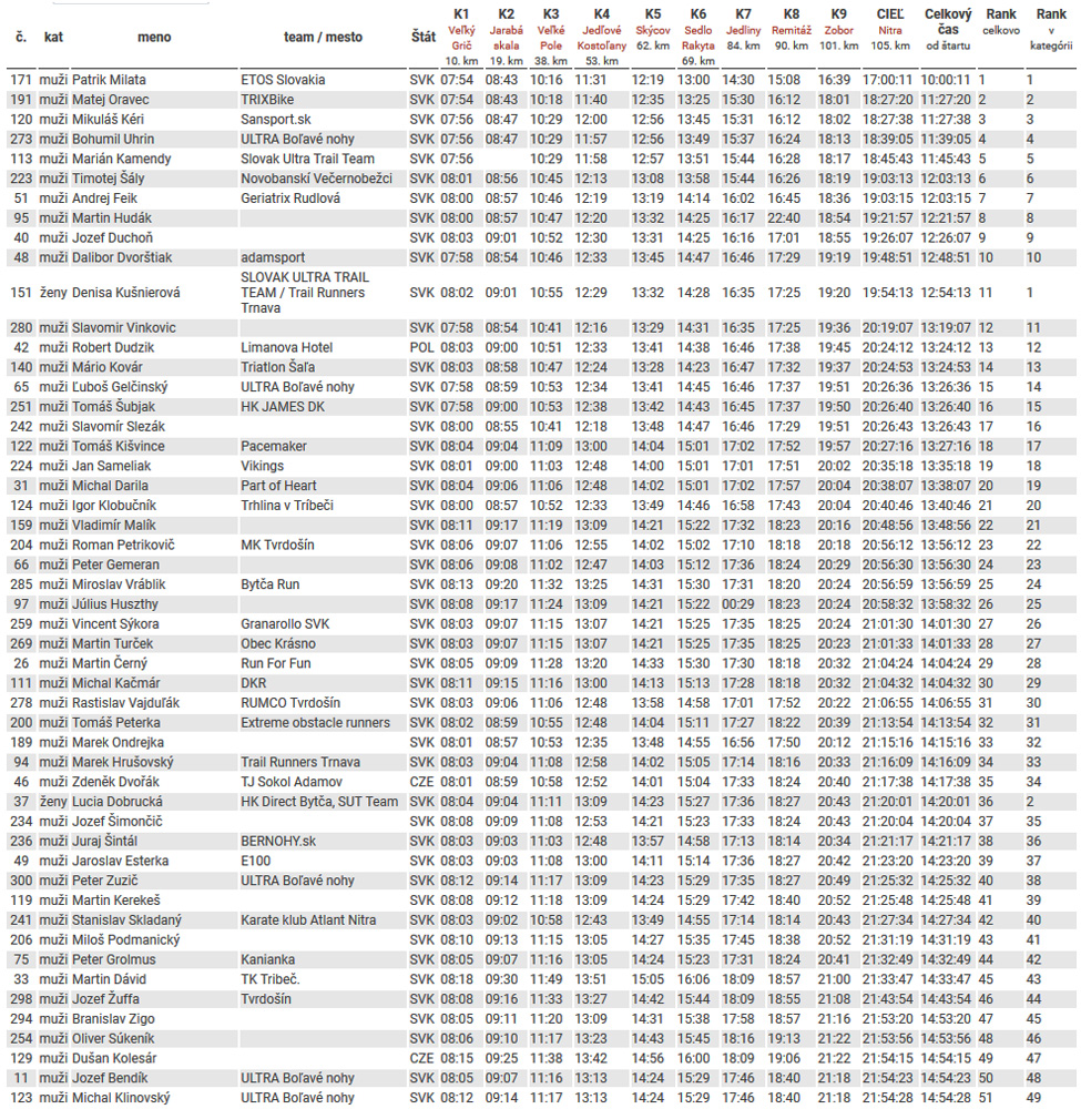 Malá špekulatívna úvaha: možno by tie časy boli ešte o trošku lepšie, keby bolo pod mrakom. Lebo to ostré svetlo vytváralo najmä ráno v lese okolo Vtáčnika poriadne kontrasty – a striedajúce sa ostrovčeky svetla a tieňa robia pri behu doslova taký „stroboskopický efekt“. V kombinácii s kamenistými a korenistými lesnými cestami viacerí hovorili, že im aj robilo problémy sledovať, kam došľapujú. Potom popoludní zas slnko priamo do očí tiež miestami „potešilo“. Víťazovi podľa jeho slov nevadilo. Ale ten nebežal rýchlo, ten pomaly letel, to je iné.