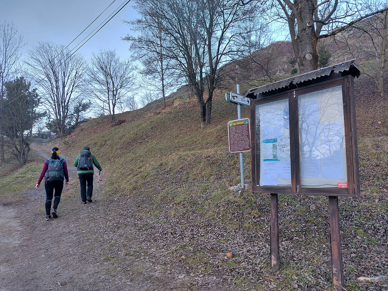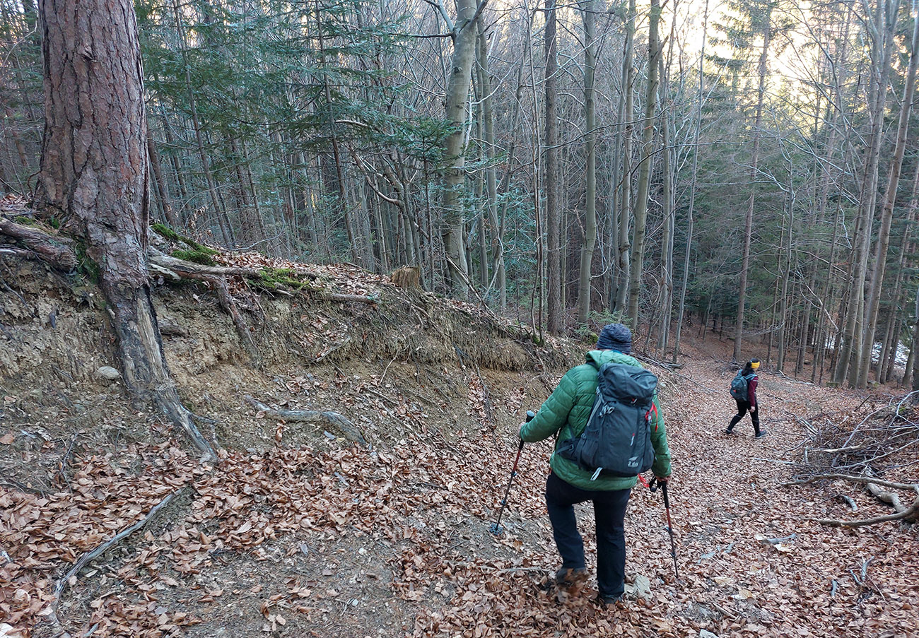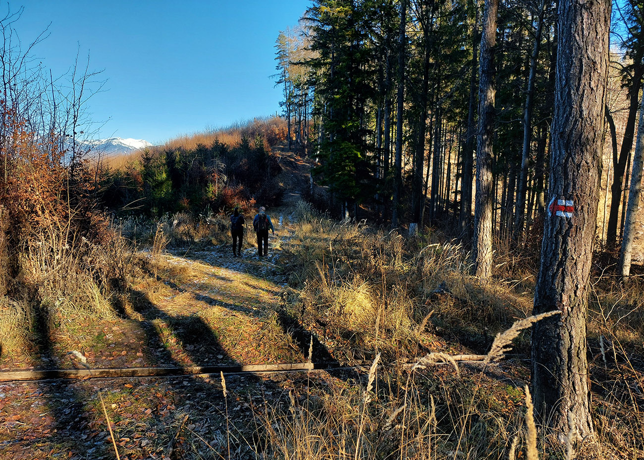 Dno podhradskej doliny je tradične rozjazdené traktormi, tak sme to švihli hore na hrad, a to už bola príjemná prechádzka na záver. Väčšinou lesné chodníky a šuchot lístia pod nohami. Aj vynorenie do panorámy nad dedinou cestou dole z hradu, s protiľahlou Krivánskou Fatrou, krásne nasvietenou:
