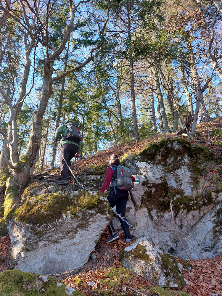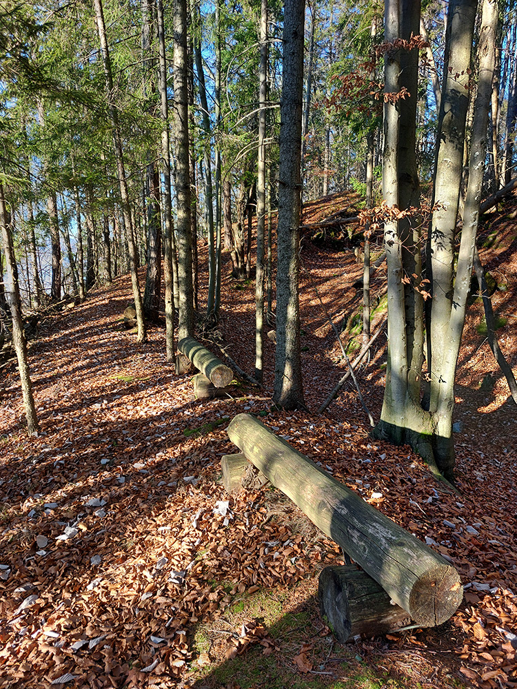 Návrat kúsok po červenej na križovatku zvážnic a z nej pevnou cestou priamo pod Prieložnicu, na lúku so soliskom, kde sa nenápadne odpája chodník na vrchol. Ten je pekne strmý, hore ešte okorenený bralkami, cez ktoré sa treba vyštverať na samý vrchol. Ale aj kus provizórneho zábradlia tam je, v najstrmšom.