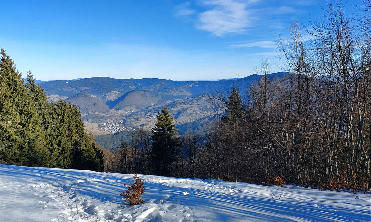 A teraz už seriózne teda... Na rozchodenie tak akurát do kopca, okolo dvoch zvoničiek nad Bielou do sedla Príslop. Po trávnatých chotárnych cestách a po ovčích prtiach, z hlbokého, mrazivého tieňa na ostré slnko. S naberaním výšky čoraz širšie panorámy: vpredu bralá pod Čapicou, vľavo Veľký Rozsutec, vpravo zalesnené dolnooravské dominanty:
