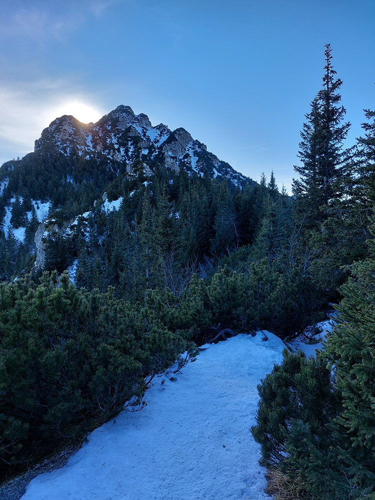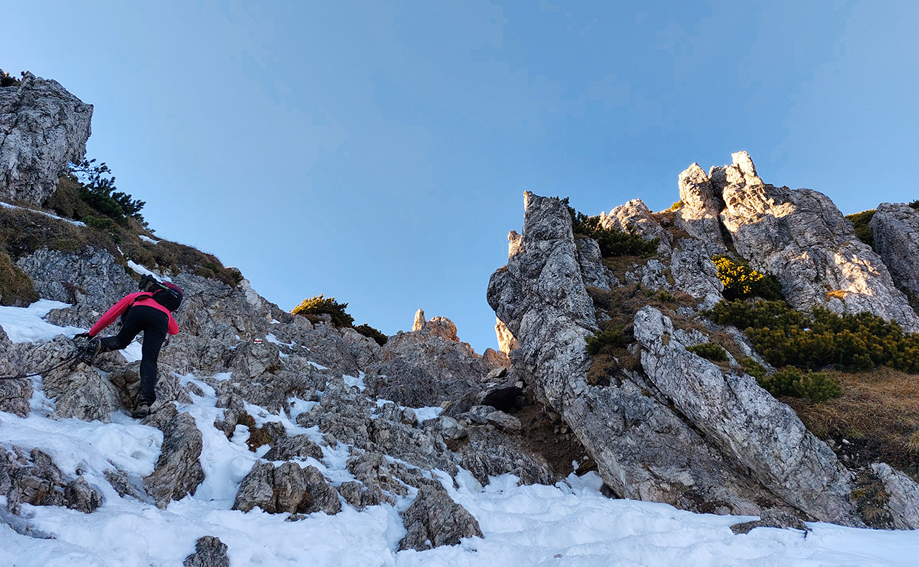 Nazad dole, medzi sedlami jedovato prefukuje a v tieňoch prituhuje, tešíme sa, ako sa ohrejeme výstupom na Veľký. Aj tu cestou pár pekných miest na predýchanie a pokochanie. A kontrast zavinený polohou a výškou zimného slnka: