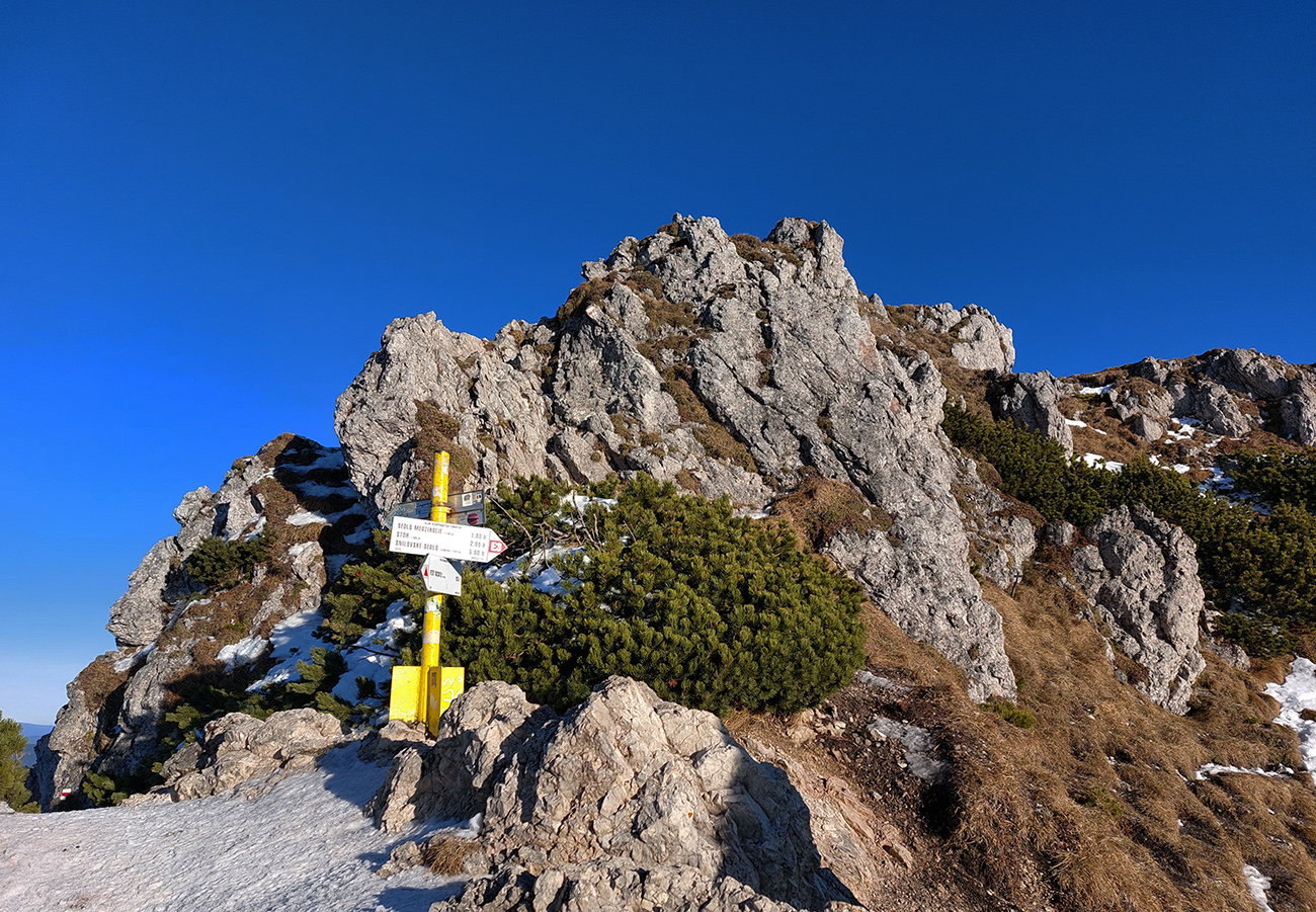 Malý Rozsutec nasvietený a výstupová stena suchá, ide sa hore, keď už sme tu. Samozrejme v tieňoch aj ľady pod nohami, ale dalo sa aj bez mňaukania. Skôr zubami poriadne škrípali tí, ktorí mačky vytiahli vyvenčiť sa. Dokonalú vrcholovú panorámu netreba predstavovať, akurát hlavný cieľ dňa sme mali priamo v protislnku.