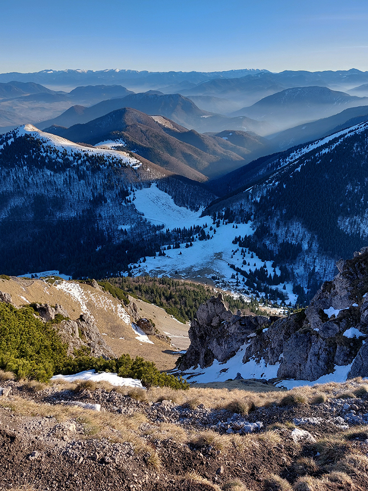 Na rovinkách pred sedlom Zákres už snehu skoro ako v zime, ale starého, tvrdého, s prešliapanou stopou, žiadne prebáračky. Ešte dáke vyhliadky – už aj Západné a Nízke Tatry, Choč v plnej paráde a hmly v kotlinách: