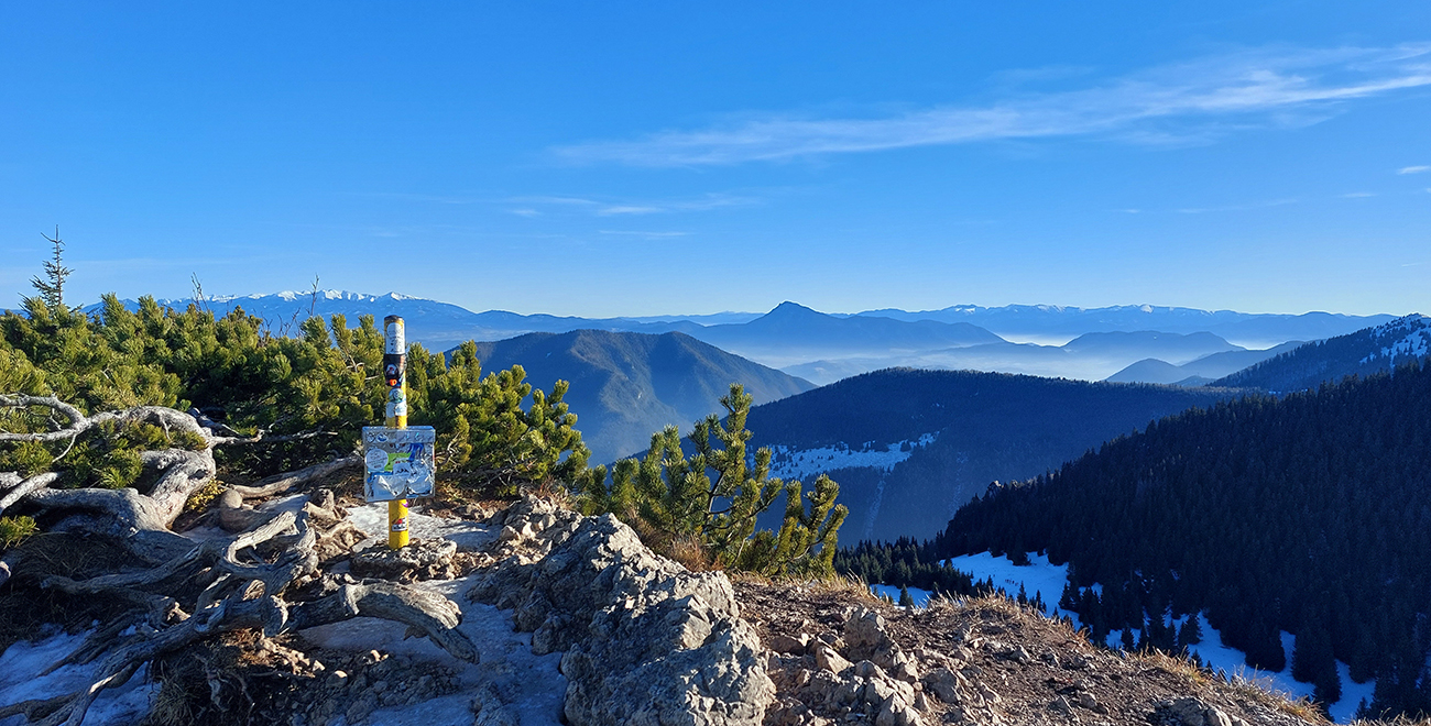 Hore prefukuje fest, ale dajú sa nájsť aj ohriate miestečká v závetrí, tak piknikujeme na predvrchole, a potom ideme už len na krátku návštevu ku smerovníku, ružici a krížu. Aj preto, lebo je tam husto. Furt tie isté panorámy, škoda hovoriť, akurát čo vidíme nové, že aj Turčianska kotlina je na dne mrazáku.