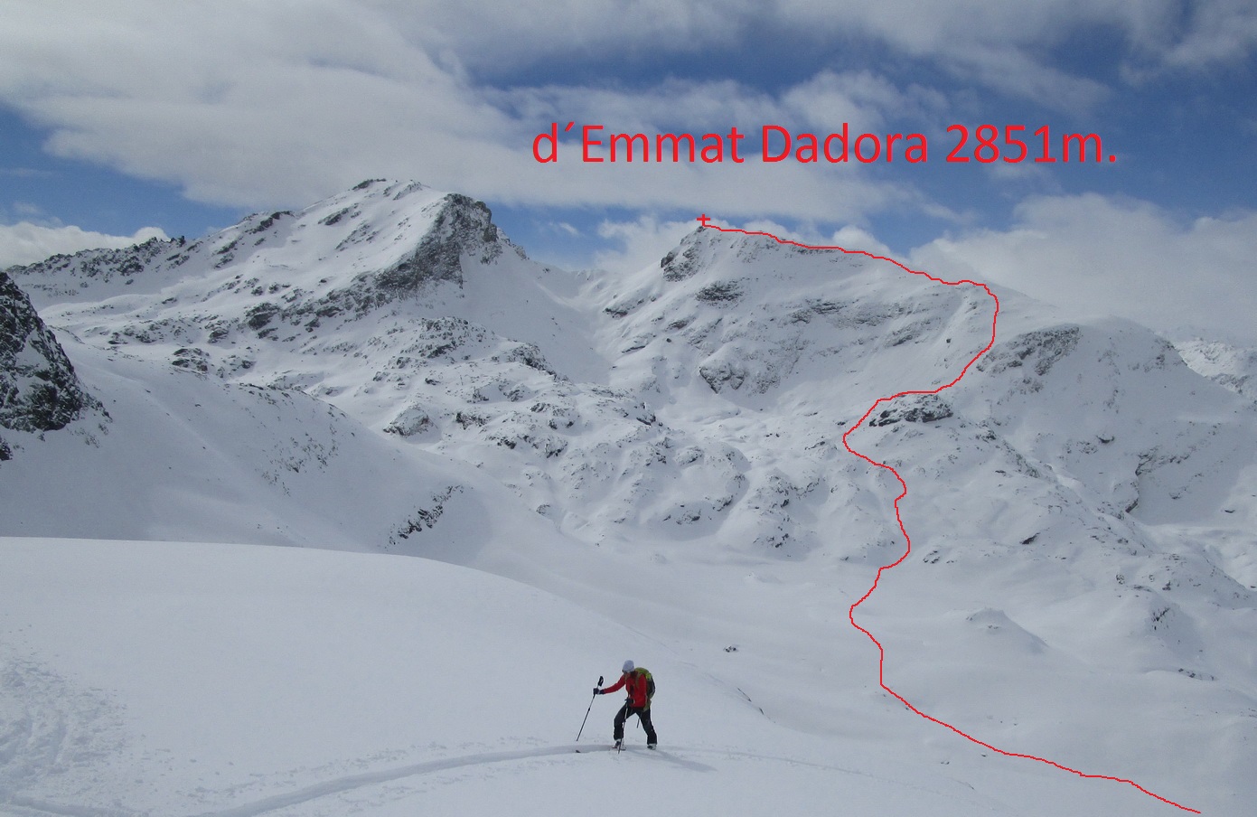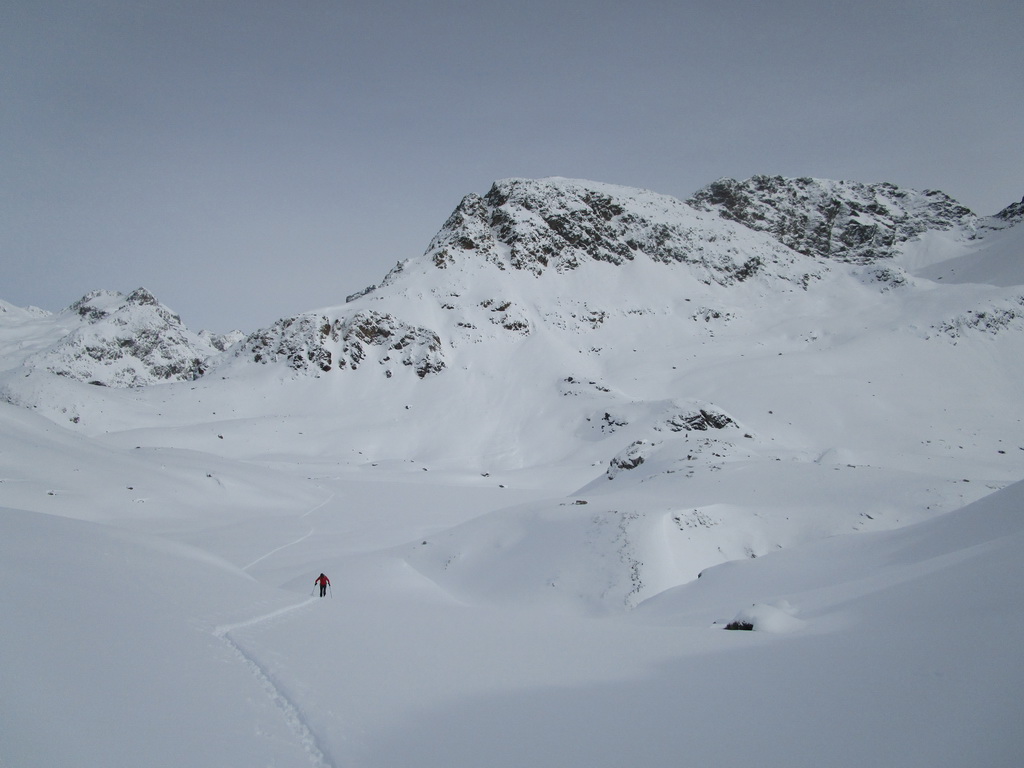 Tá úžasná rozmanitosť a dostupnosť skialpových cieľov Julierpassu ma neprestáva nadchýnať. Táto túra je spracovaná z archívu z roku 2016 - (4. marec). Parkovali sme pri Hospici La Veduta. Oproti parkovisku sa prejde cez cestu, zapnú sa lyže a šlapeme. Najprv do sedielka pod Coluonasom. Odtiaľto sa pustíme na pásoch ku zamrznutému jazeru. Náš cieľ je tentoraz Piz dEmmat Dadora. Ten pravý kopec z dvojice krásavcov s čudáckymi menami.